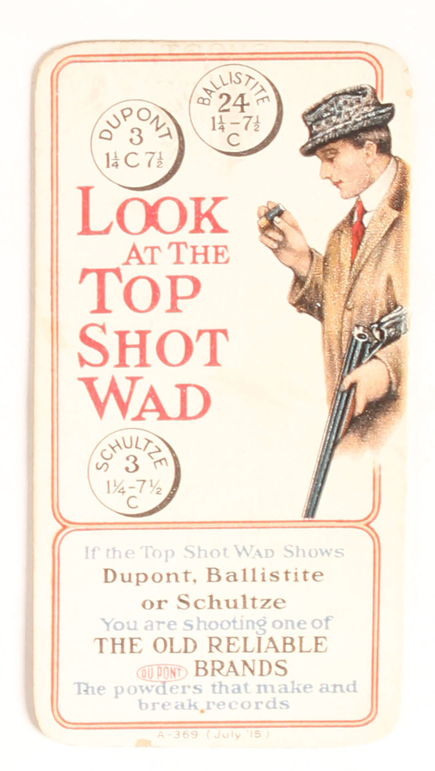 Dupont Ballistite Score Card, unused, has near mint image of trapshooter, back side has unused score card, 2 3/4'' x 5''. Grade: Excellent ++ - Value: 16 to 100