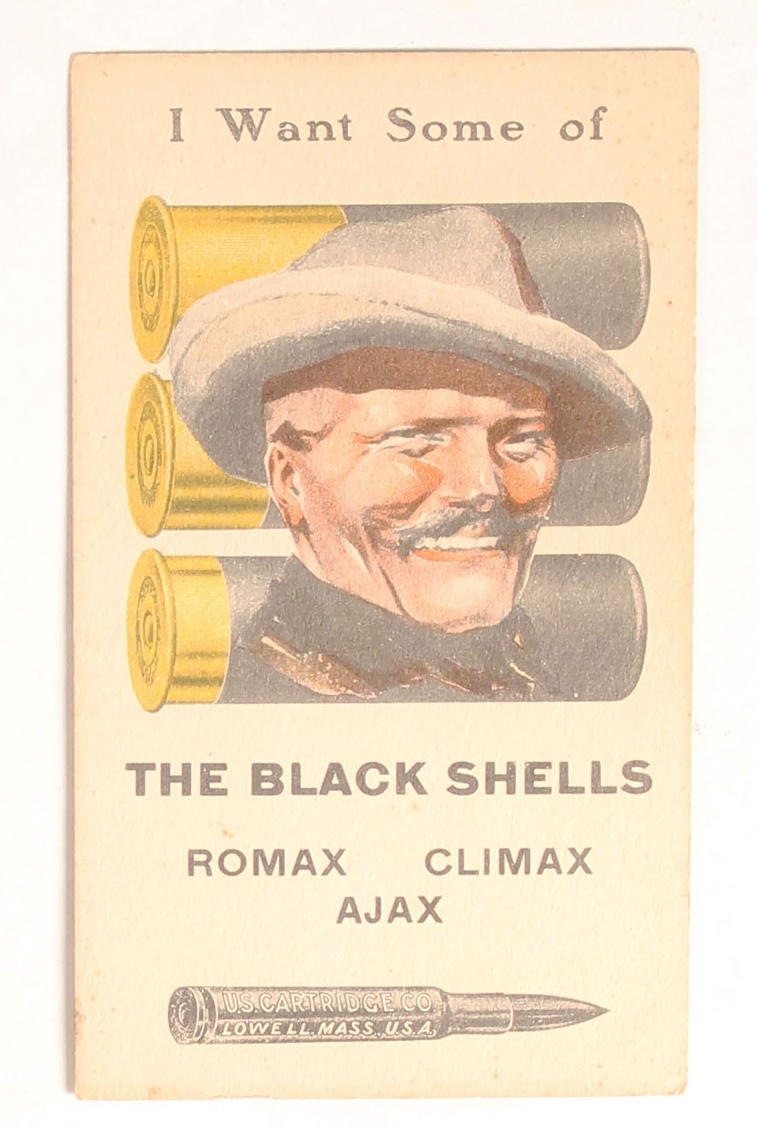 U.S. Cart The Black Shell Score Card, unused, has near mint image of shells & hunter, back side has unused score card & trap shooting scene, 3 1/2'' x 6''. Grade: Excellent ++ - Value: 30 to 100