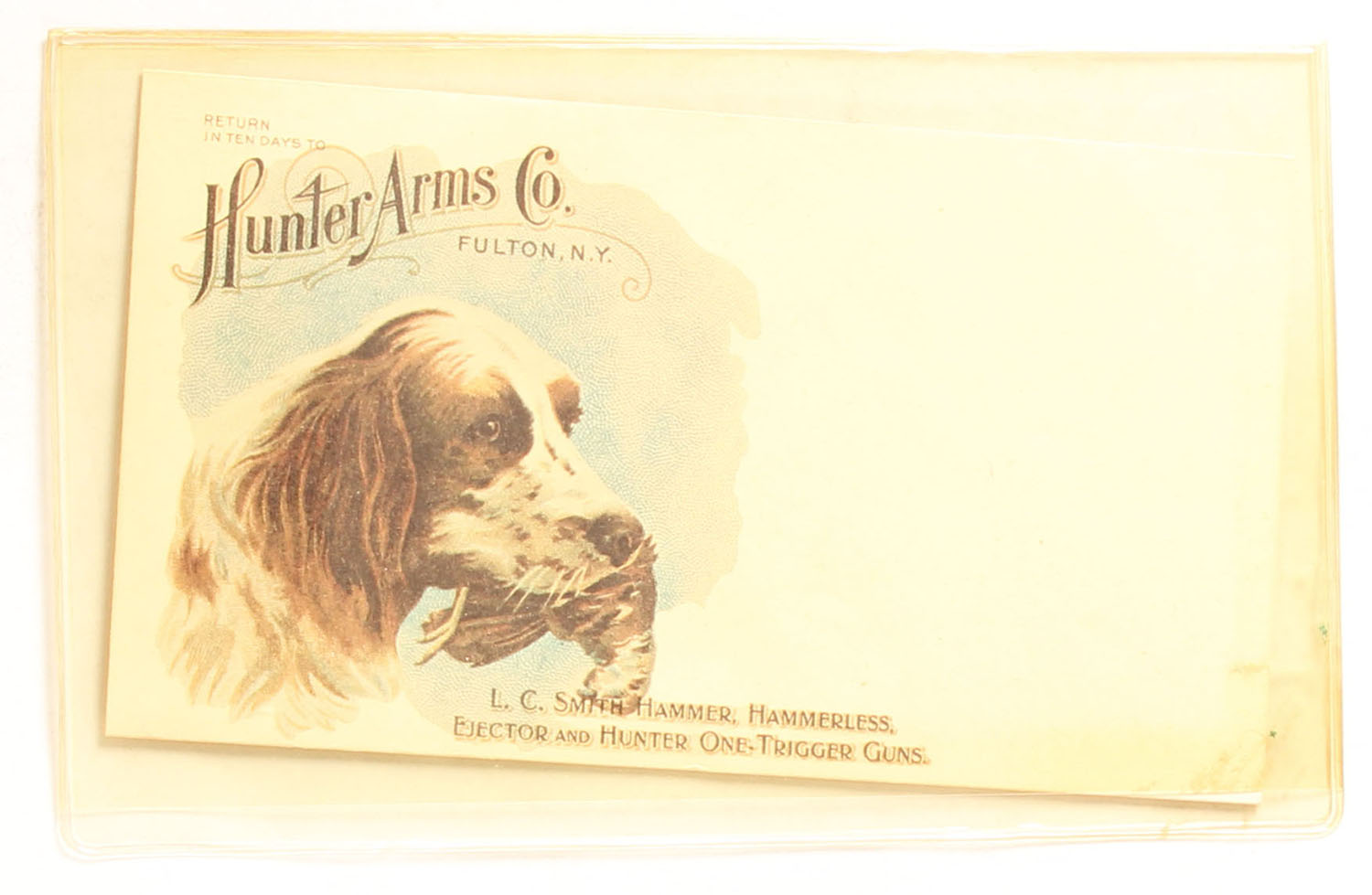 Hunter Arms Co. (L.C. Smith) Envelope, unused, image of setter. Grade: MINT - Value: 30 to 200