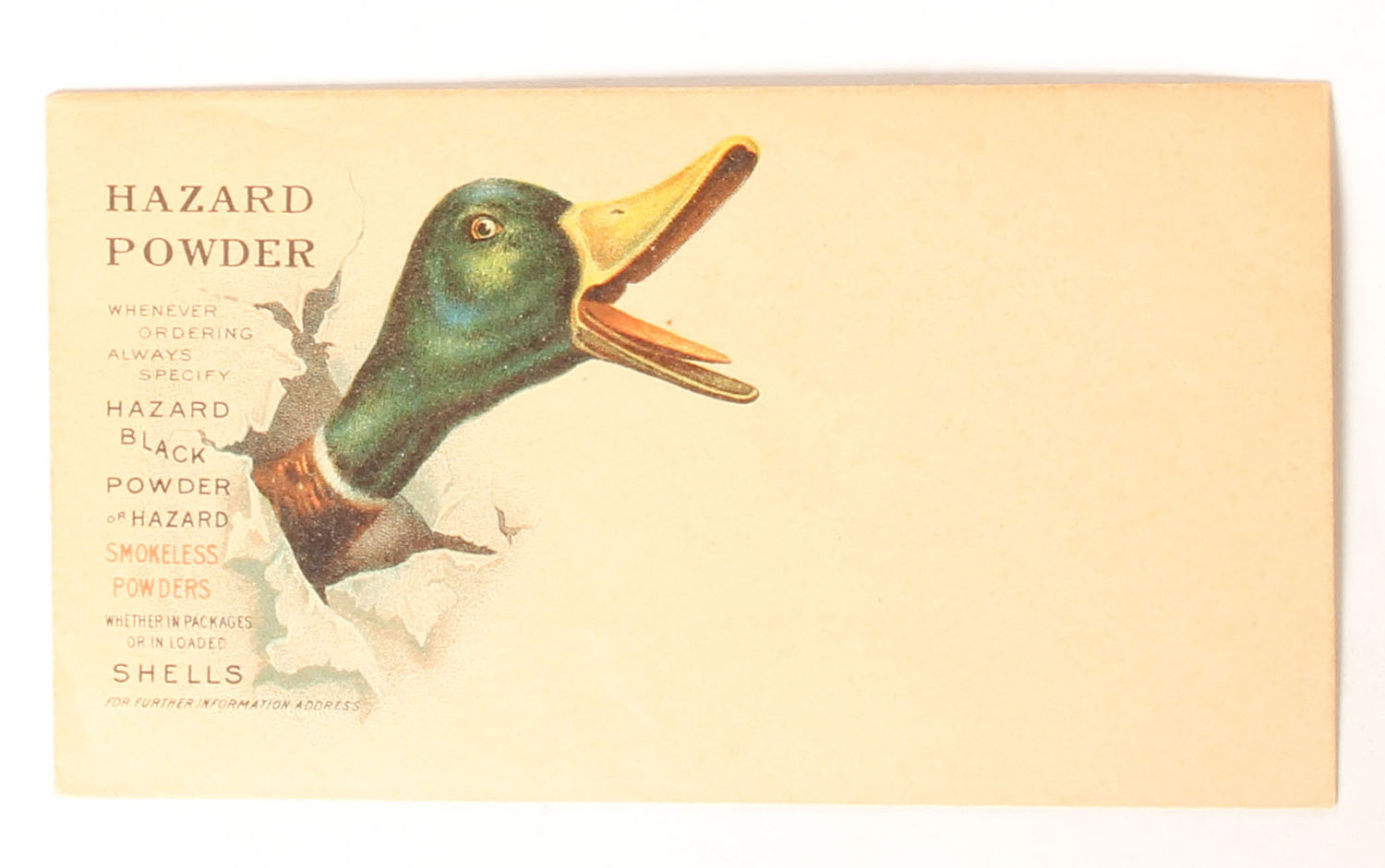 Hazard Powder Co. Envelope, unused, image of mallard drake coming through the envelope. Grade: Excellent - Value: 30 to 200