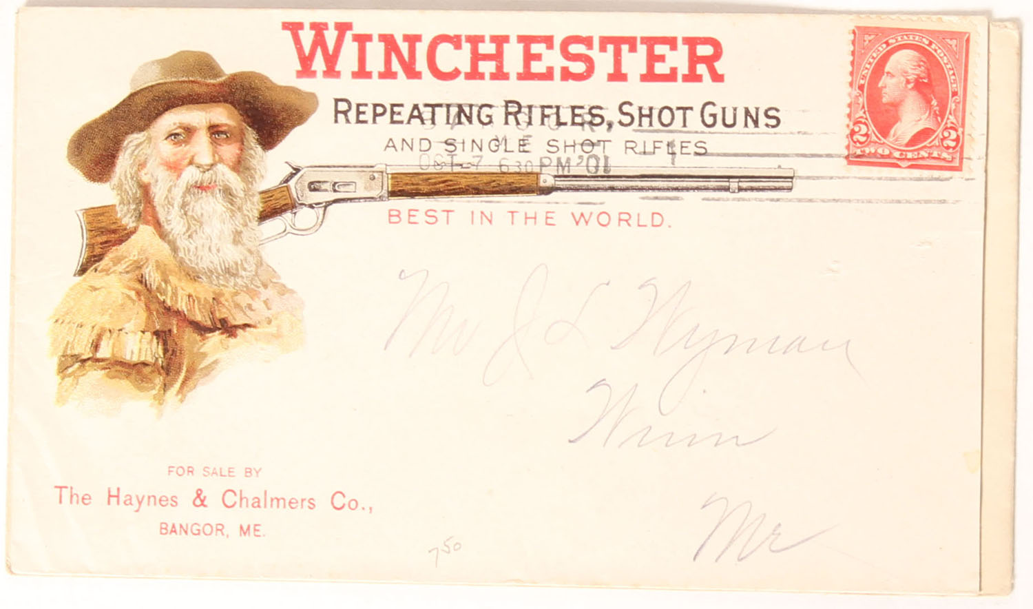 Early Winchester Repeating Rifles, Shot Guns Envelope, Circa 1901, fantastic full color image of old Chin Whisker & a model 73. Grade: Excellent + - Value: 60 to 300