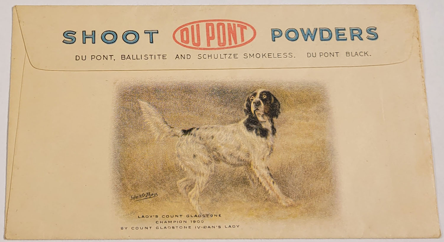 Shoot Dupont Powders Envelope, unused circa 1900, full color image on back of 1900 Champion LADY'S COUNT GLADSTONE english setter on point, front return address for hardware Co. in Alaska, some age soiling. Grade: Very Good ++ - Value: 20 to 150