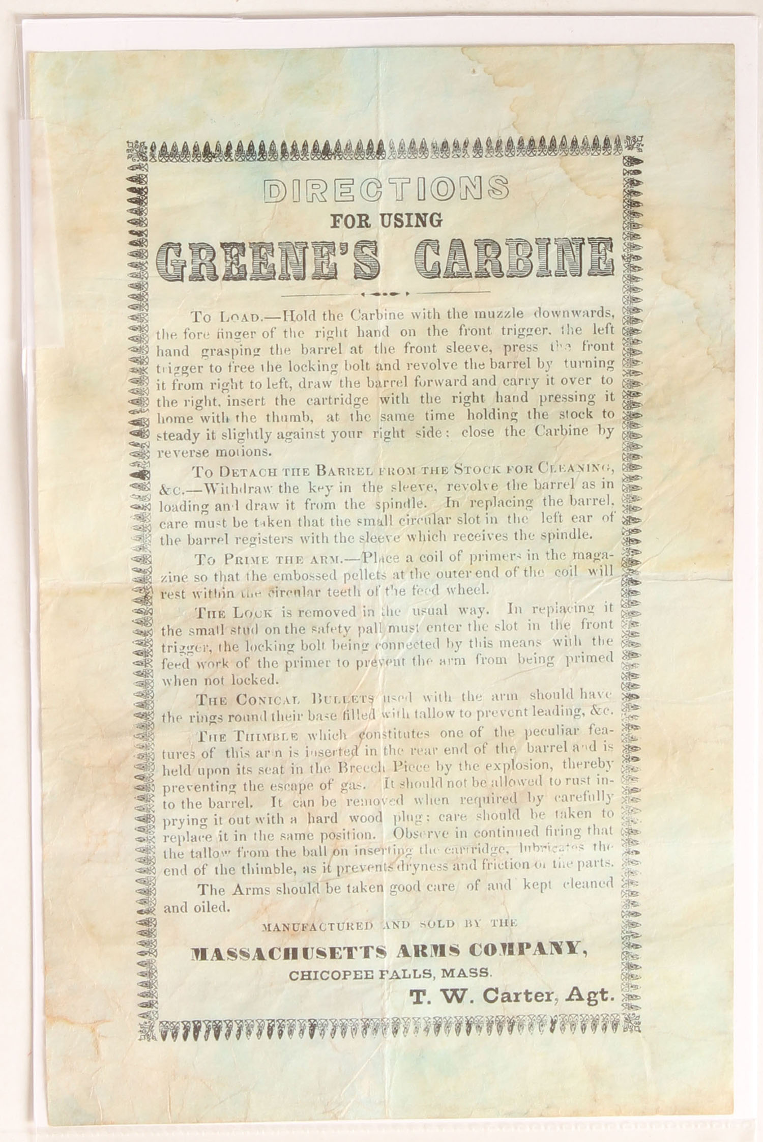Massachusetts Arms Co. Directions for using a Green's Carbine, 100% original. Grade: Excellent - Value: 10 to 100