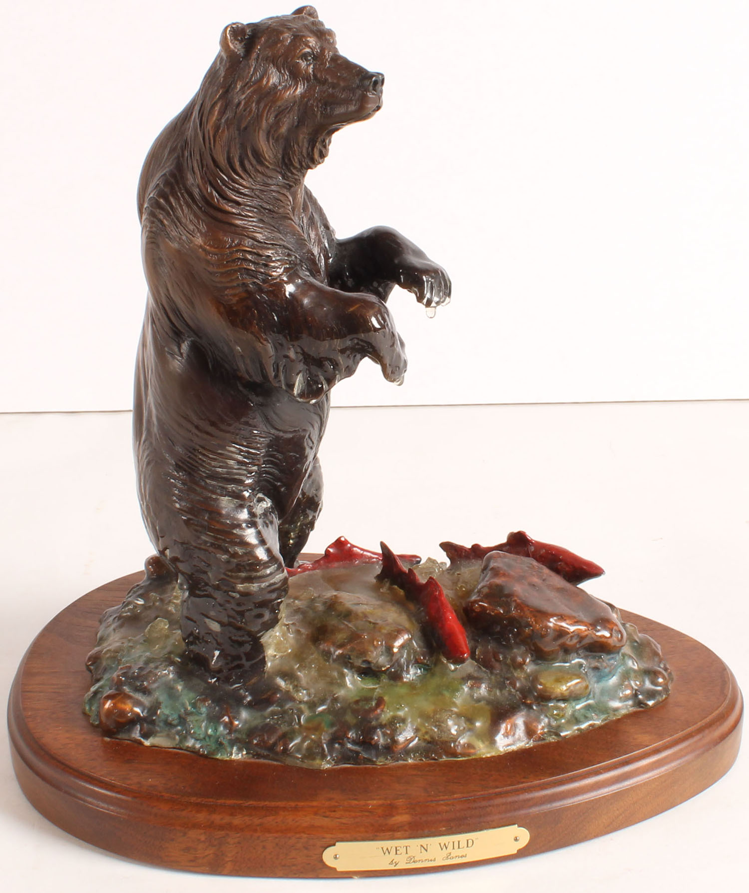 Dennis Jones WET N' WILD bronze statue, grizzly bear standing up with res sockeye salmon at his feet on wood base, #30 limited edition, 12'' x 12'' x 8''. Grade: Excellent ++ - Value: 100 to 300