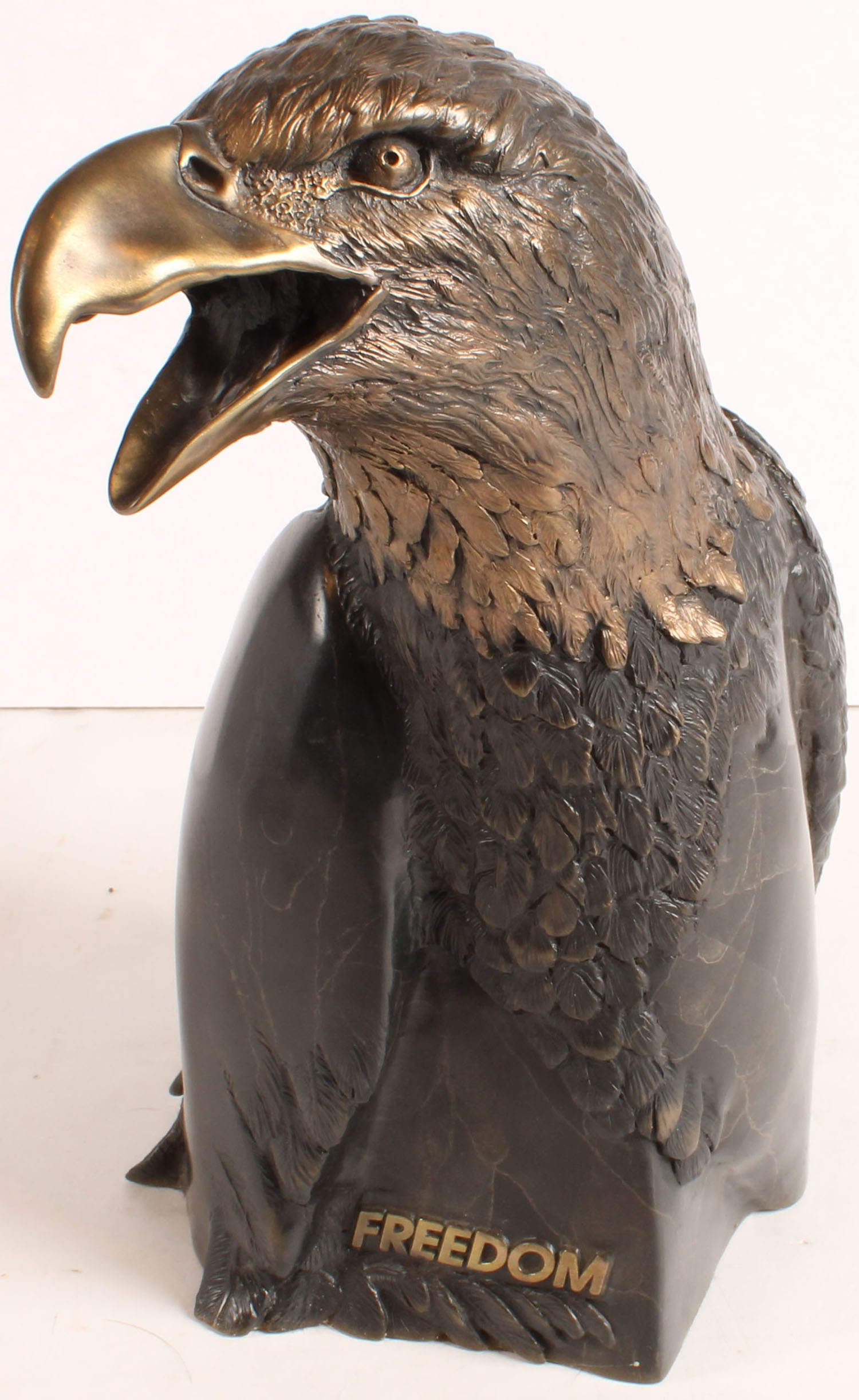 Bald Eagles head bronze statue, marked FREEDOM, singed 95 R. Leep, 12/50, 12'' x 14'' x 8''. Grade: Excellent - Value: 200 to 1000