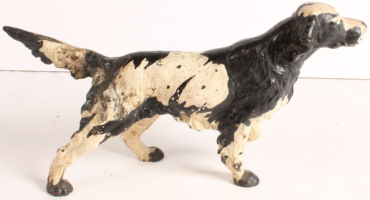 English Setter on point, made of 2pc metal, hand painted, 15'' long. Grade: Very Good ++ - Value: 20 to 200