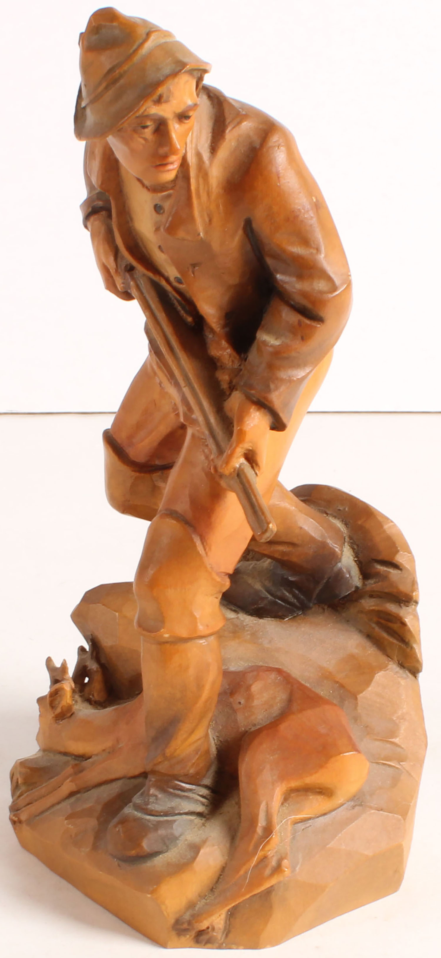 Vintage Black Forest German wood carving, show man holding a double barrel shotgun with a deer at his feet, 5'' x 9 1/2'' x 4''. Grade; Excellent - Value: 10 to 50