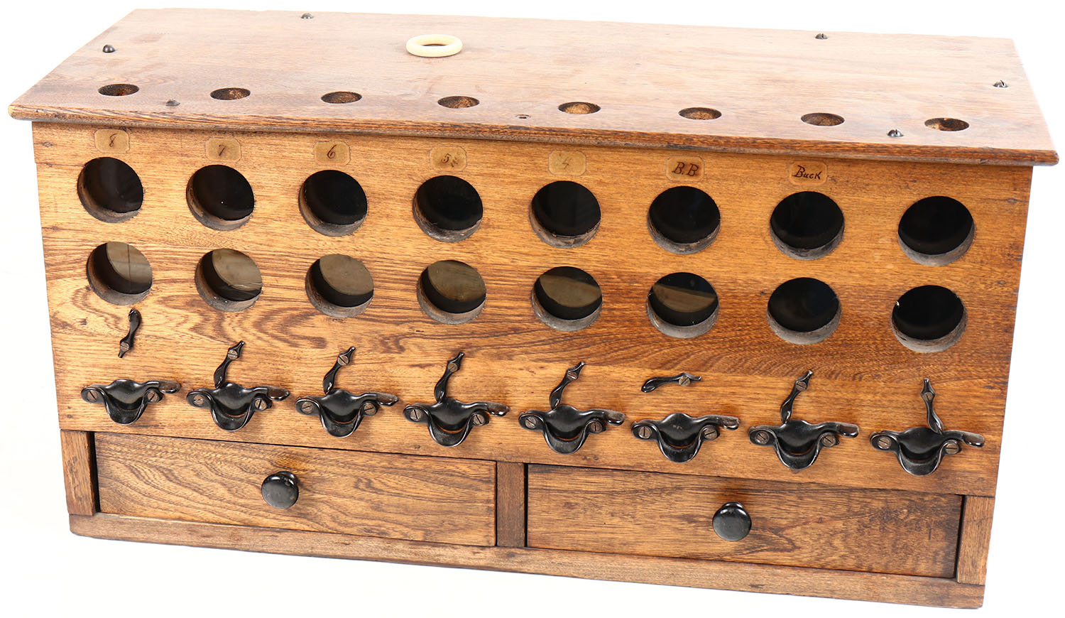 Early Shot Dispenser, used in sporting good store for dispensing shot for loading shot shells, marked ''8, 7, 6, 5, 4, BB, BUCK, unmarked'', this early oak case would be filled by the store manager from the top & the small windows shot the shot size, you would then open the latch below & shot would fall into the bag, sold by the pound, has two small drawers on bottom, 25'' x 12 1/2'' x 10'', very hard to find & this own is in great collector condition. Grade: Excellent - Value: 800 to 1500