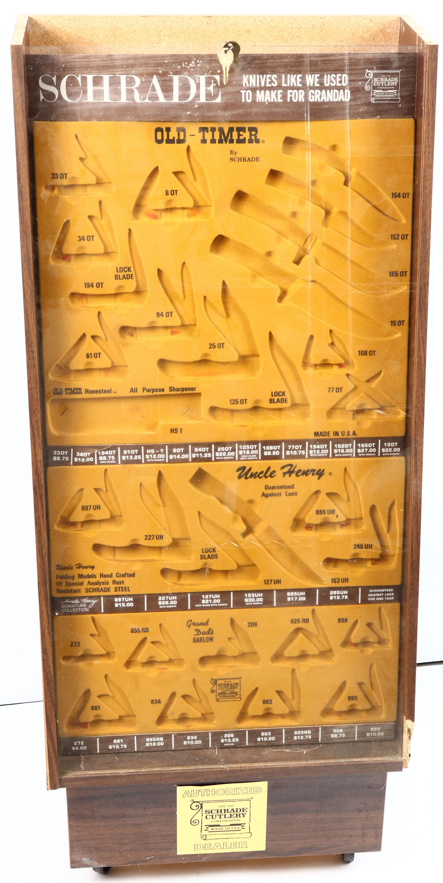 RARE! Large wood and glass Schrade knife case, 20x47x15, on wheels, no knives in case, very nice case with many different spots to display knives. Grade: Excellent - Value: 100 to 2000