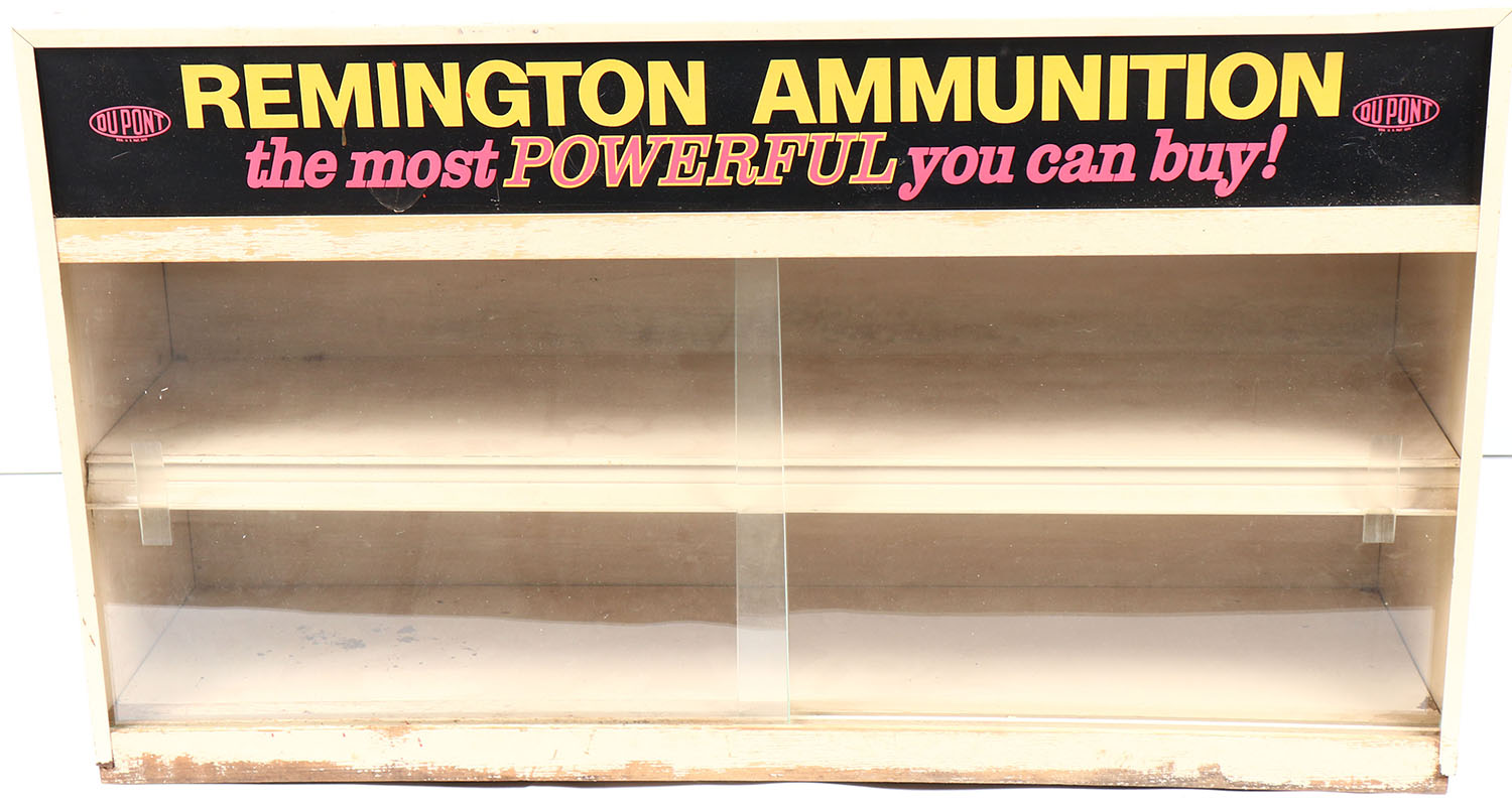 RARE! Large metal and glass Remington display case, ''the most POWERFUL you can buy!'', 36x11x21, very nice case with some handling marks. Grade: Excellent - Value: 300 to 600