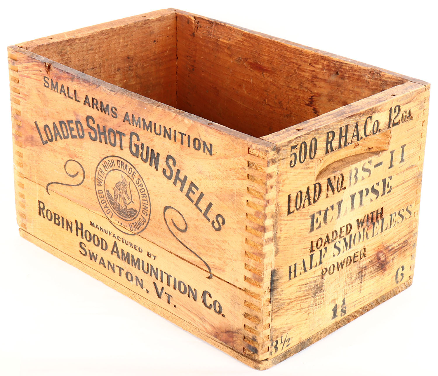 RARE! Robin Hood Eclipse wood shipping crate, 12 ga., 6 shot, tongue and groove construction, crate and black print is solid, Grade: Excellent + - Value: 300 to 600