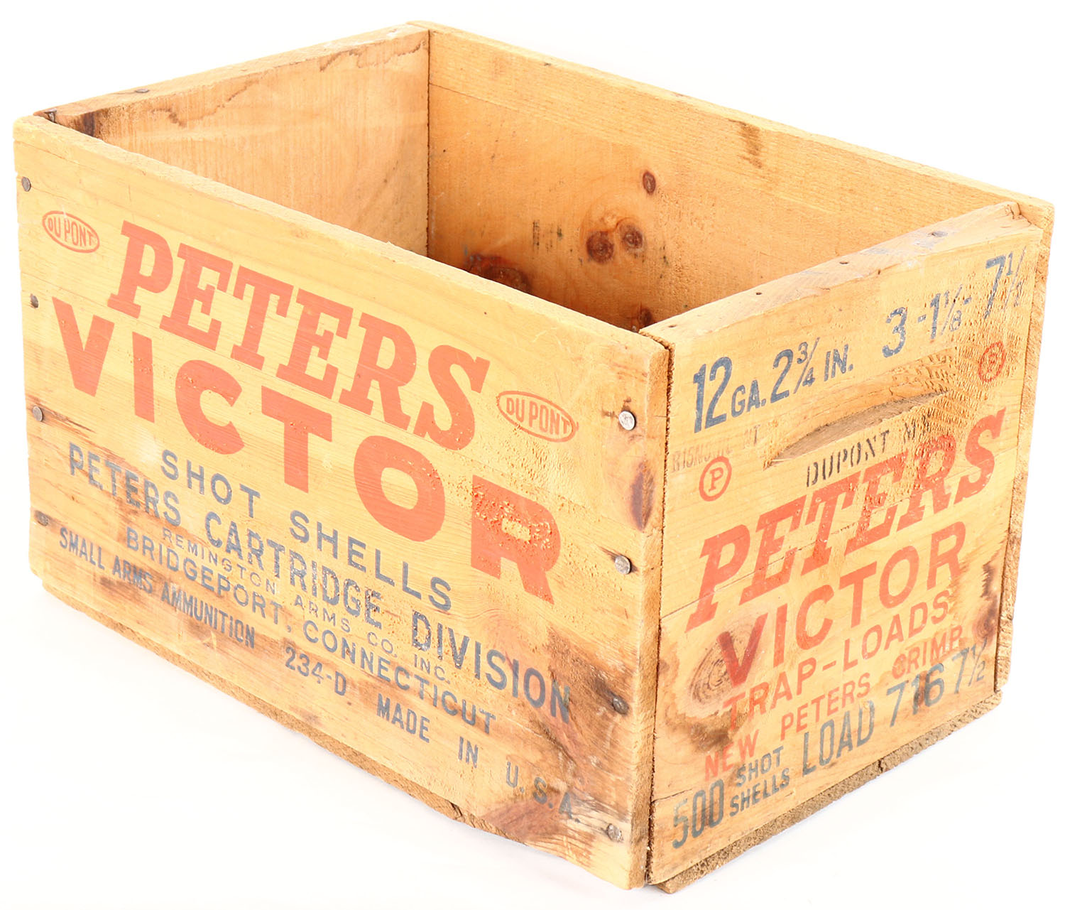Peters wood shipping crate, Victor, Trap loads, 12 ga., 7 1/2 shot, nail construction, blue & orange print is solid, crate has soiling, Grade: Very Good ++ - Value: 30 to 90