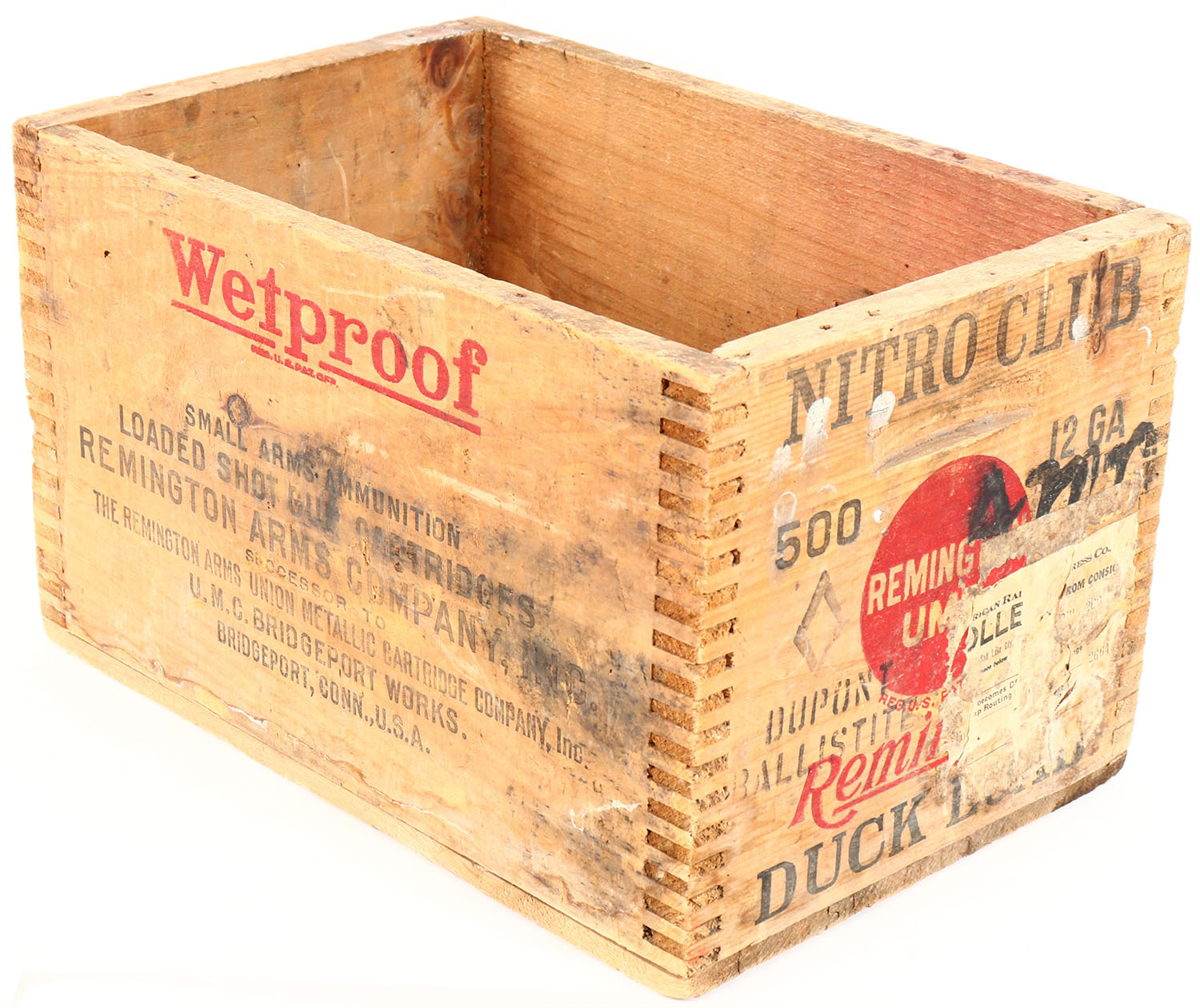 Remington UMC, 12 Ga., DUCK LOAD, red, & black print is faded in places and crate has age soiling. Grade: Very Good ++ - Value: 40 to 80