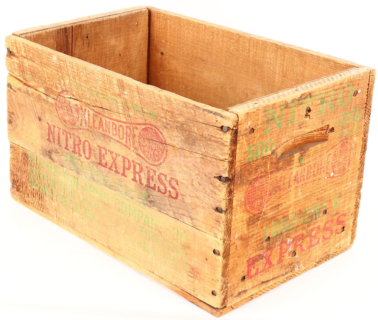Remington Kleanbore Express, 12 Ga., nail construction, red, & green print have some fading and crate is solid. Grade: Very Good ++ - Value: 6 to 40