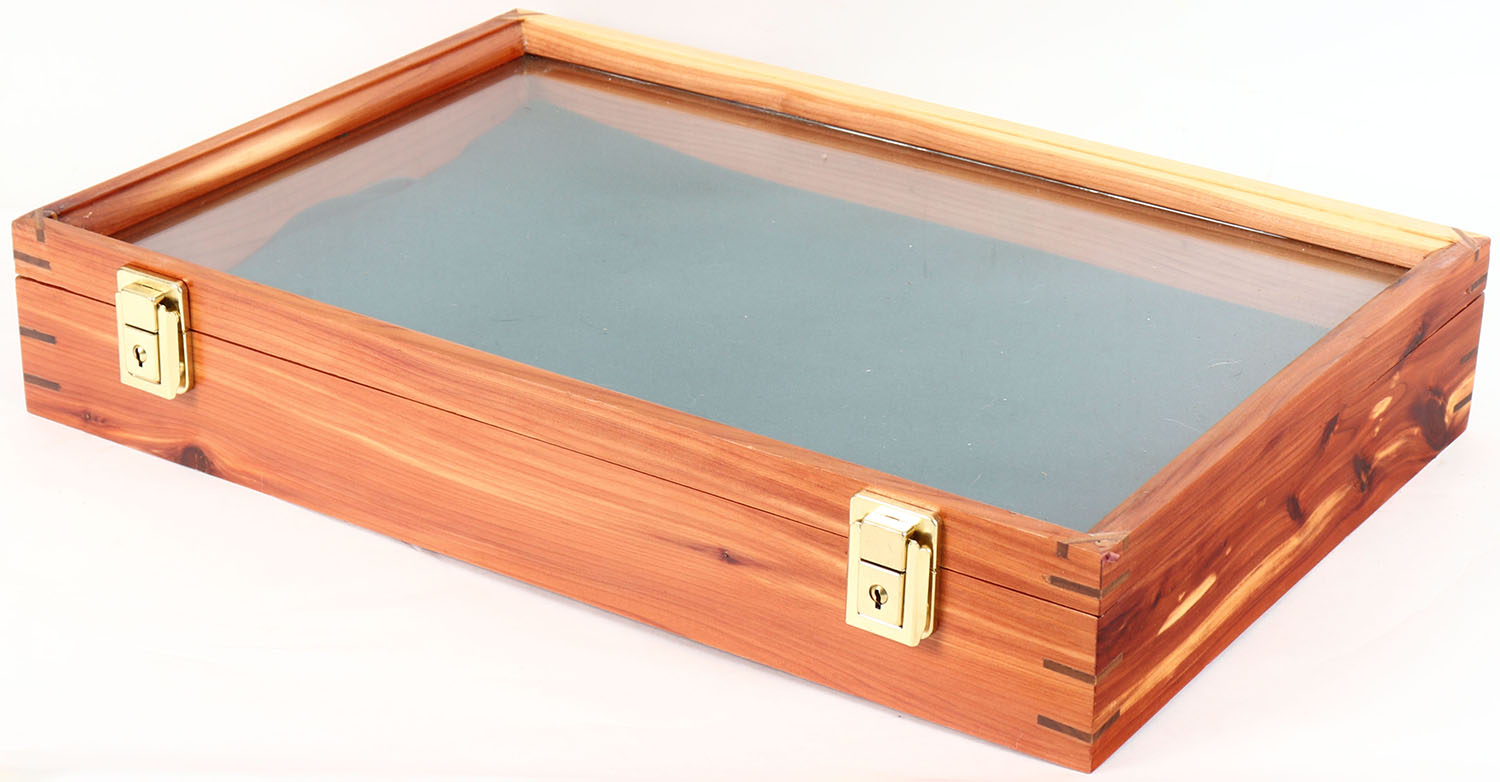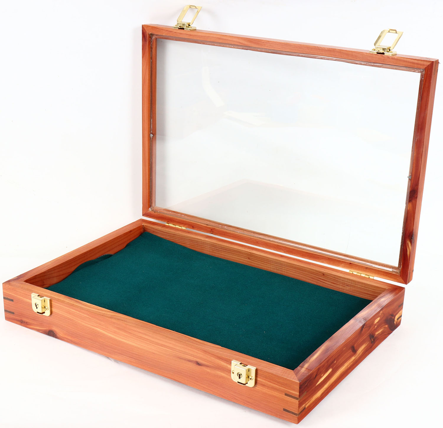 Wood display case, felt liner, 18'' x 12'' x 3 1/2''. Grade: Excellent ++ - Value: 40 to 400