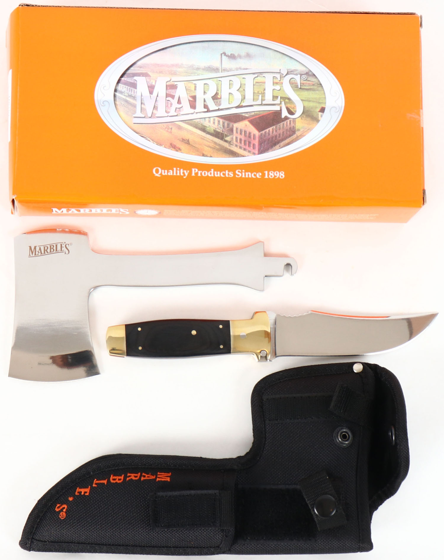 Marbles Hatchet and knife combo, brand new, in box with sheath, very nice Grade: Excellent ++ - Value: 50 to 100