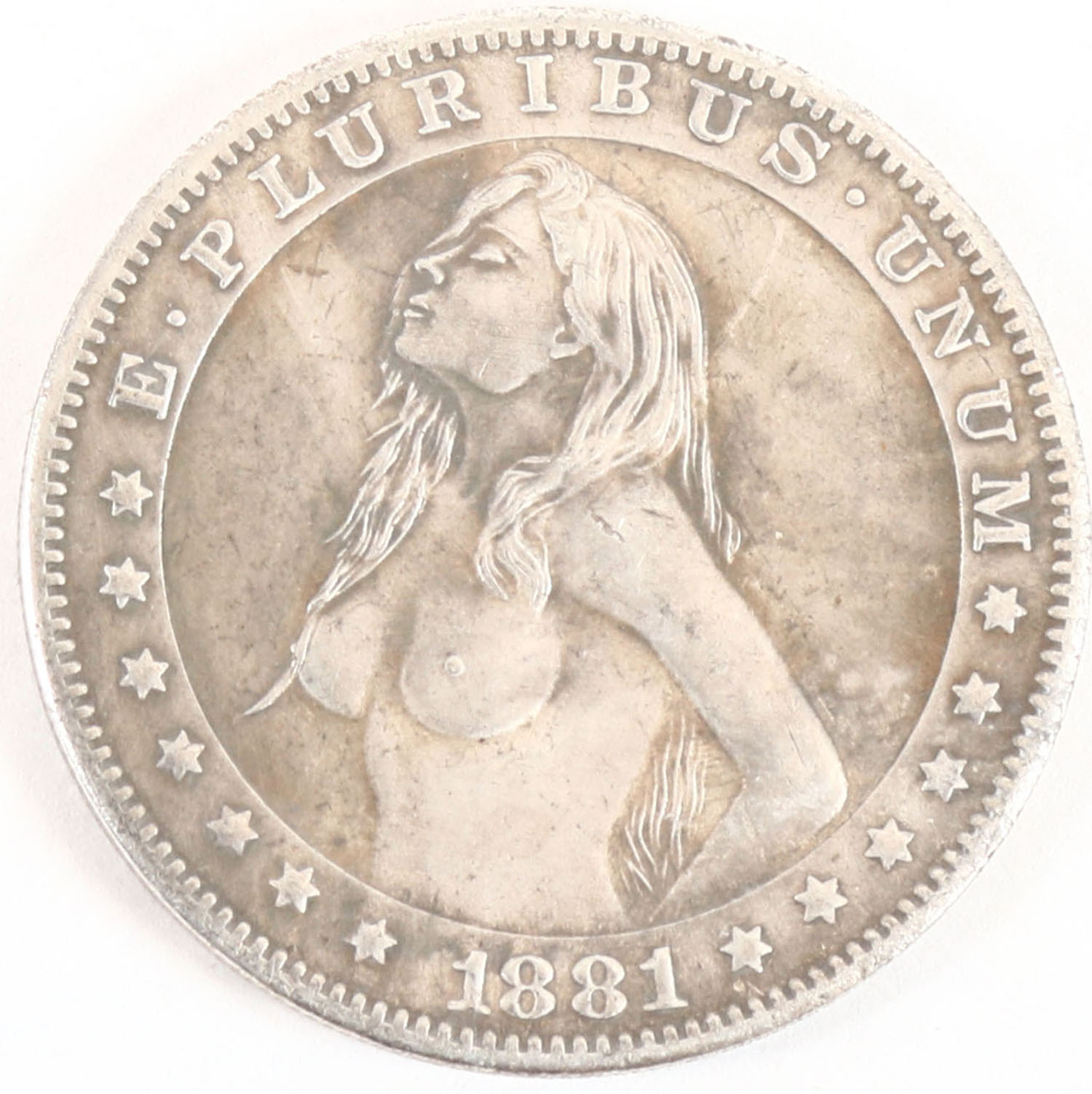 RARE! 1881 nude silver dollar coin with eagle on back. Grade: Excellent - Value: 100 to 400