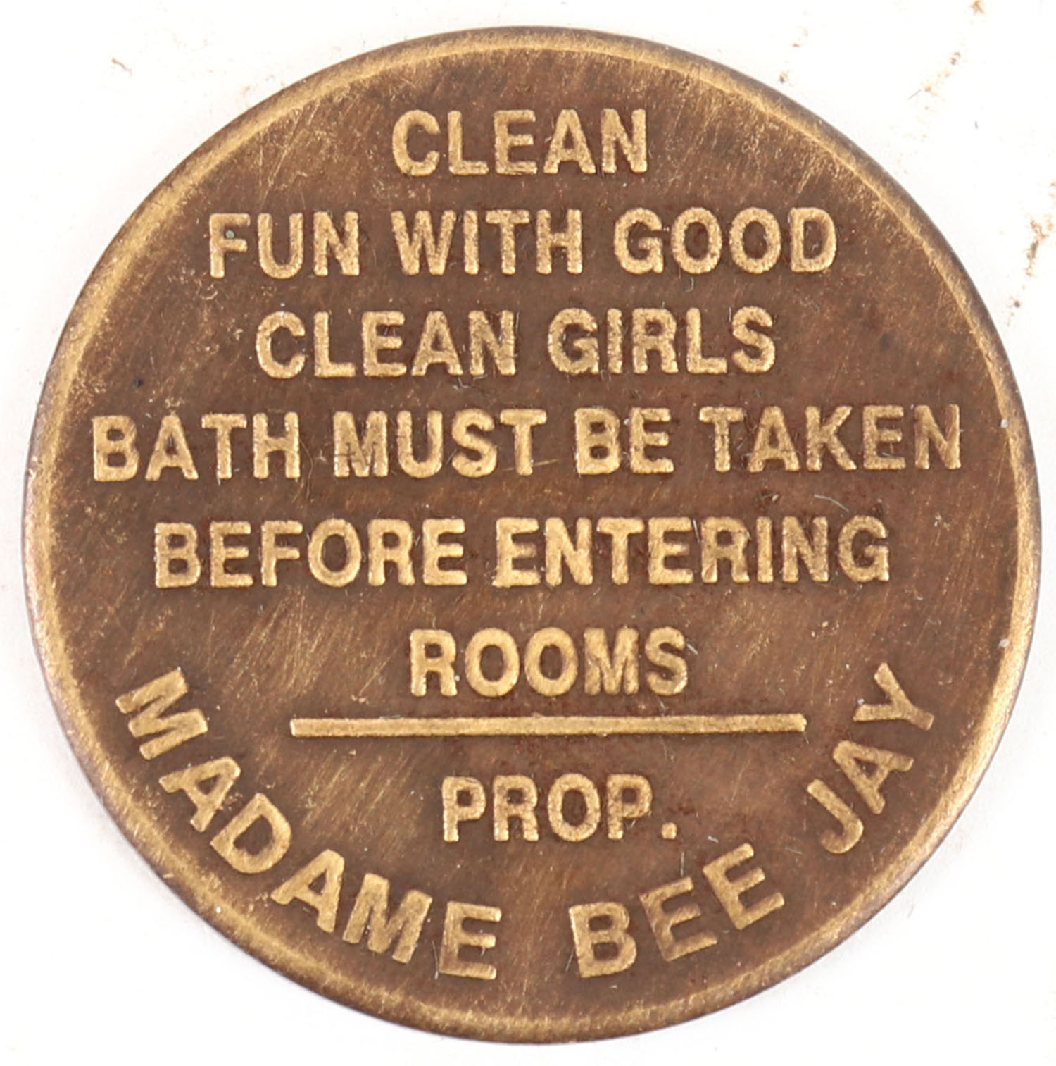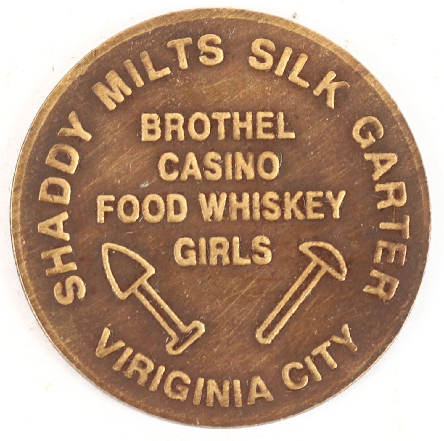 Double sided Brothel Token. ''Shaddy Milts Silk Garter''. Grade: Excellent - Value: 10 to 40