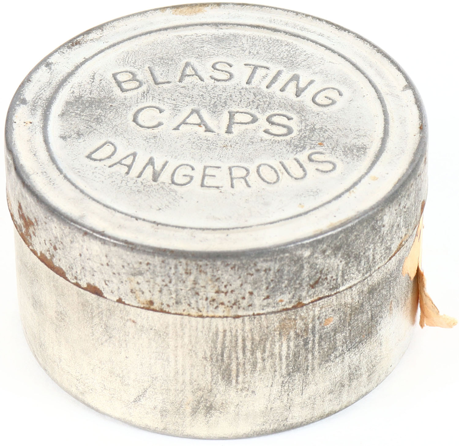 Blasting caps tin, empty, has scuffing. Grade: Very Good + - Value: 10 to 50