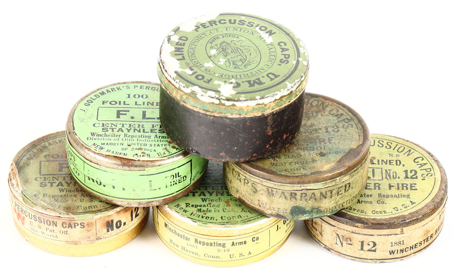 Lot of 6, percussion caps, various manfs., 5 partial 1 empty, all have age soiling. Grade: Very Good - Value: 10 to 60