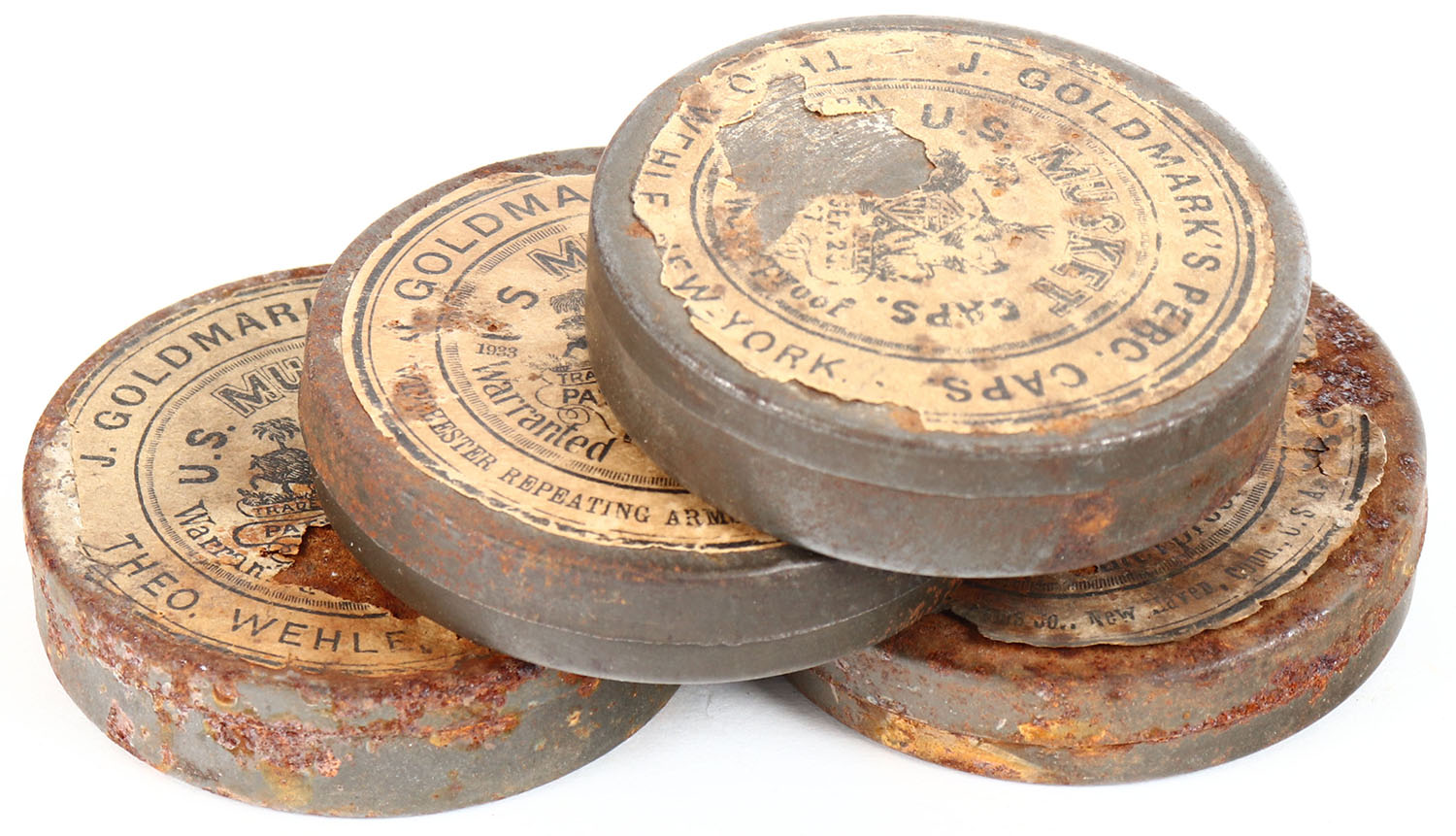 Lot of 4 J.Goldmarks Musket caps, 3 partial and 1 empty. Grade: Good - Value: 2 to 20