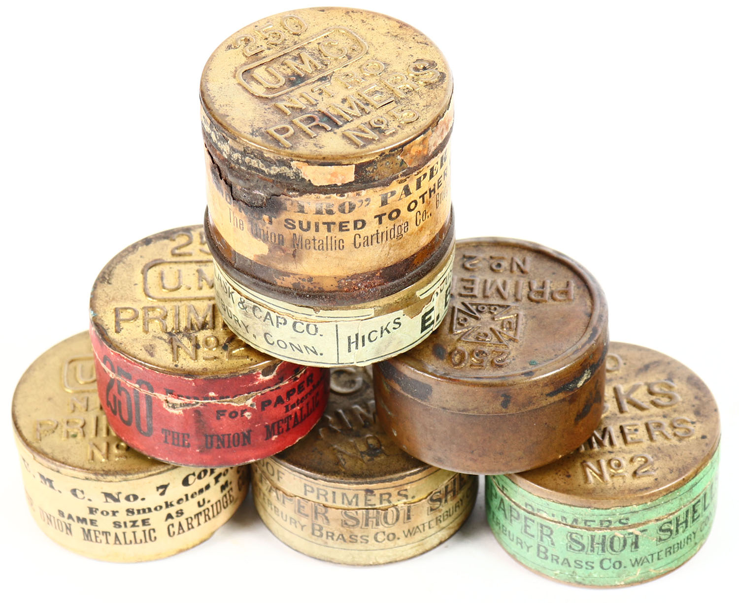 Lot of 7 Early UMC and AM Flask & Cap co., 1 Union cap co., 5 partial and 2 empty. Grade: Very Good ++ - Value: 10 to 60