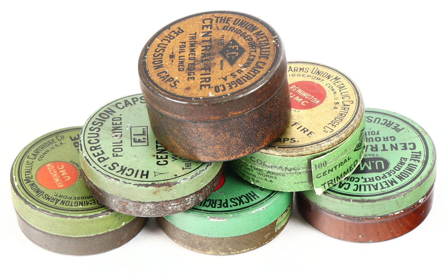Lot of 6 percussion cap or primer tins, 3 partial and 3 empty. Grade: Very Good ++ - Value: 6 to 60