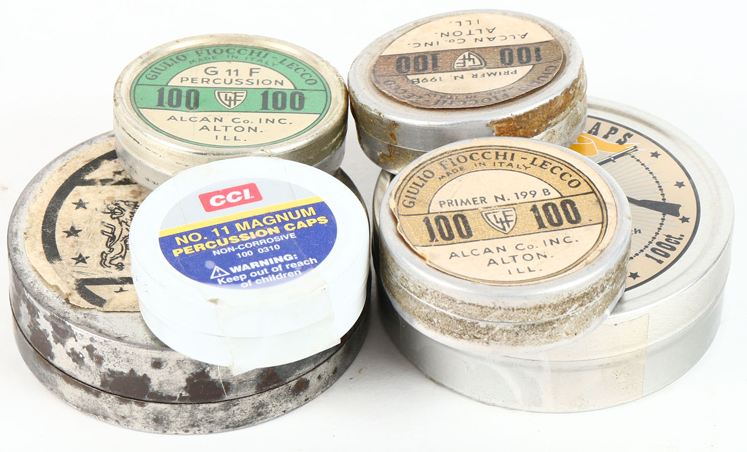 Lot of 6 percussion cap or primer tins, all. Grade: Very Good ++ - Value: 4 to 40