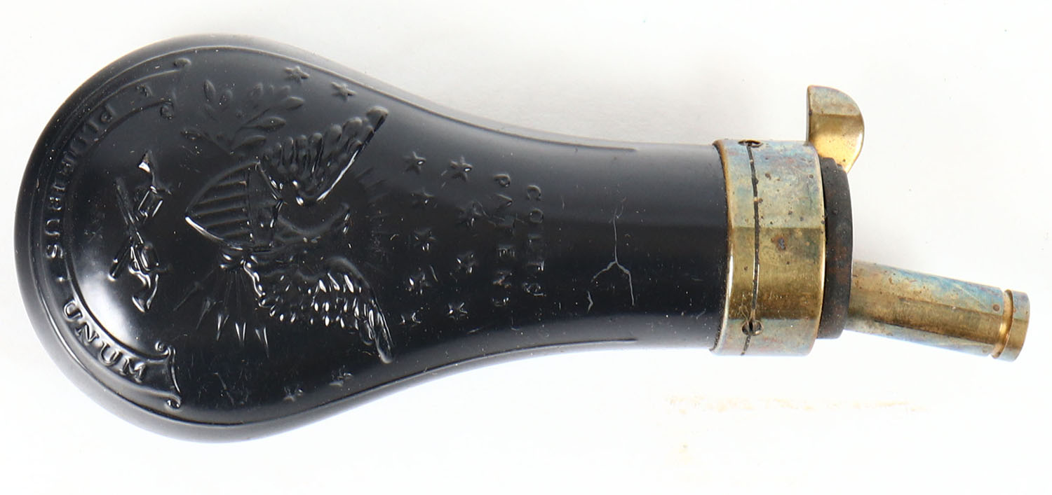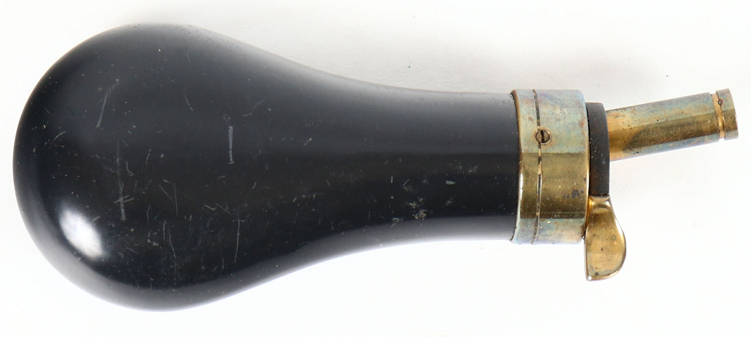Small Brass Powder flask, unmarked with beautiful design, has age soiling Grade: Very Good - Value: 10 to 50