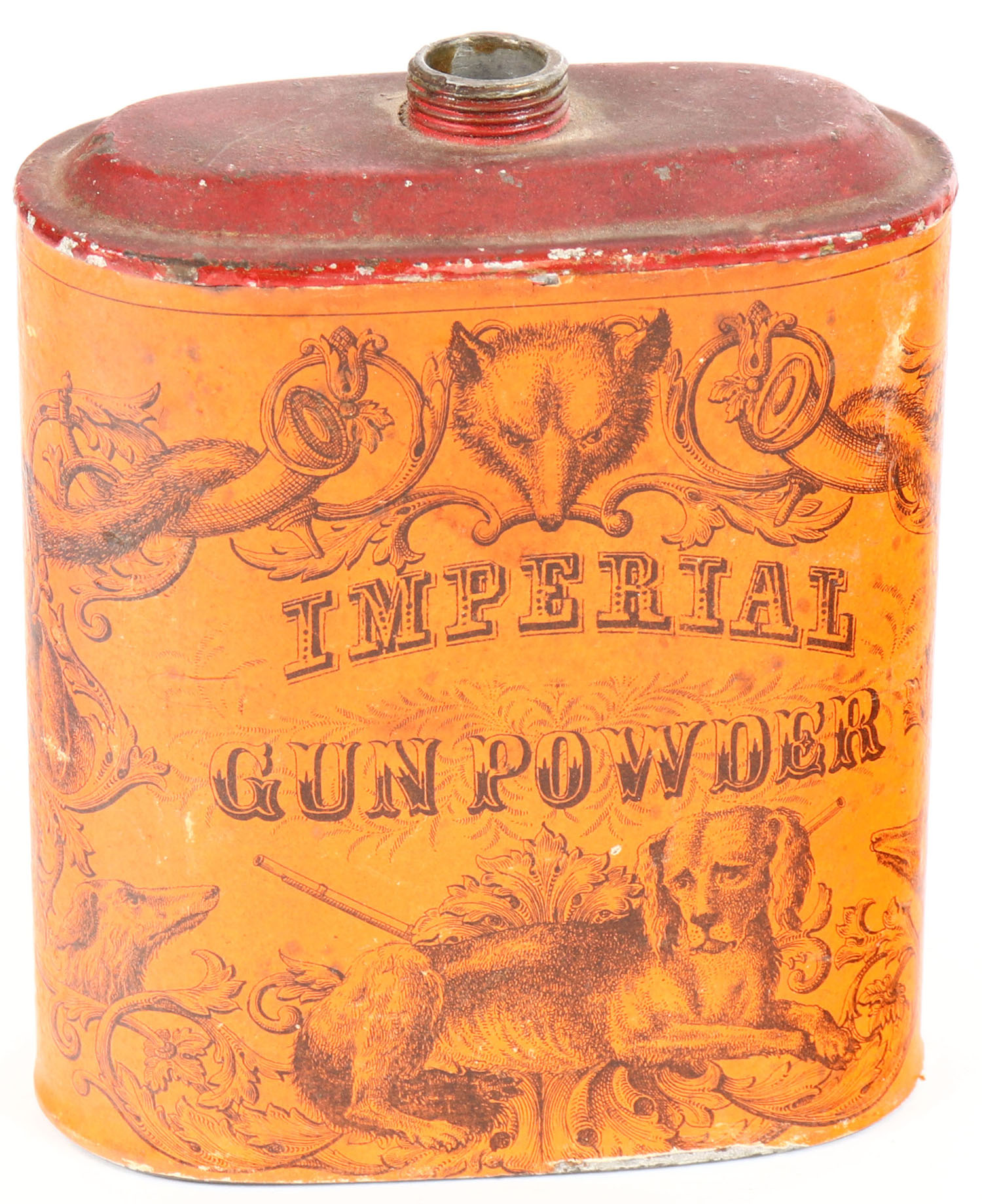 RARE! Eureka Powder works Imperial Gunpowder tin, empty, orange and black able around red tin, some scuffing but still solid. Grade: Very Good ++ - Value: 50 to 200
