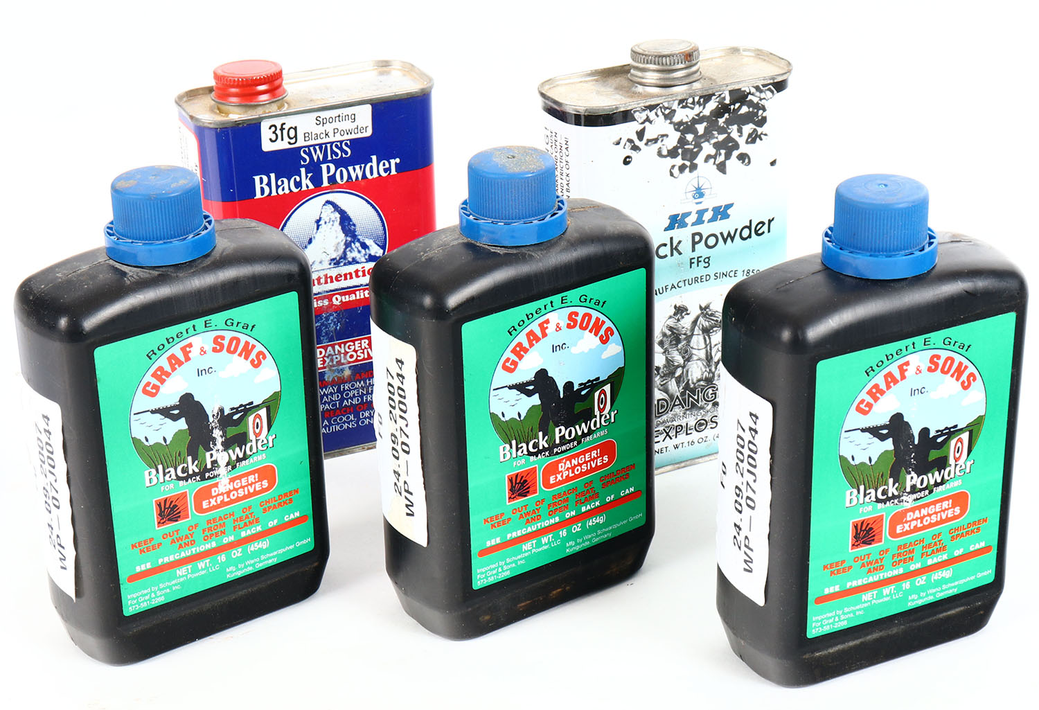 Lot of 5 black rifle powder, all Full. Grade: Excellent - Value: 20 to 80