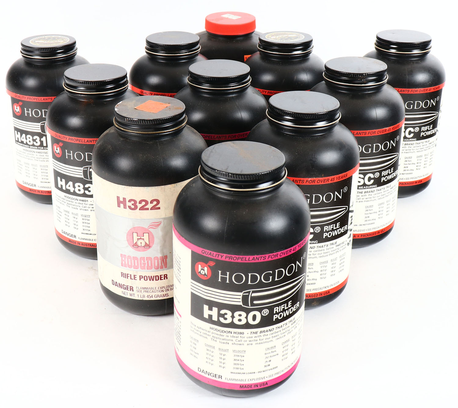 Lot of 11 rifle powder, all partial. Grade: Excellent - Value: 100 to 400