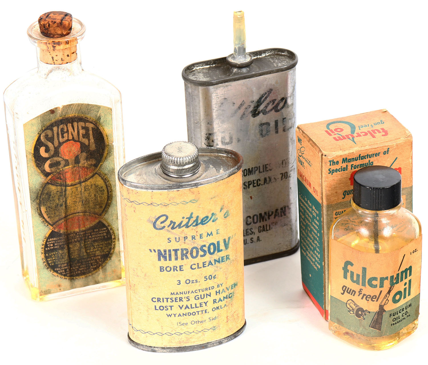 Lot of 4 oil tins, 3 empty and 1 FULL in box, some age soiling. Grade: Very Good ++ - Value: 10 to 60