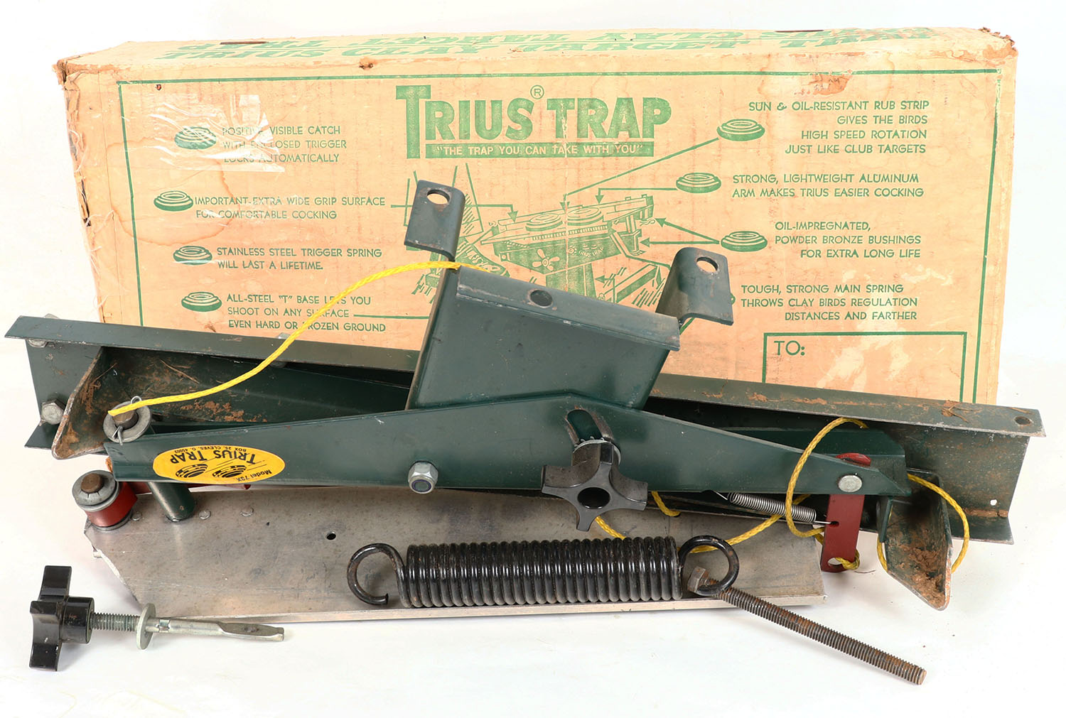 Trius clay target trap, model 73x, in orignal box, has rust, and shows use, box has tape and is weak on one end. Grade: Very Good - Value: 10 to 50