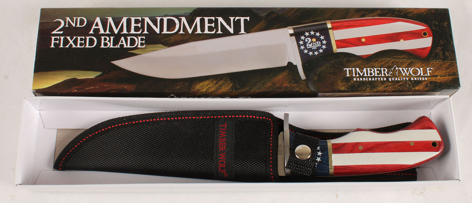 Timber Wolf Handcrafted fixed blade knife in original box with sheath, has 2nd Amendment american flag wood handle, 6'' blade, unused. Grade: MINT - Value: 6 to 60