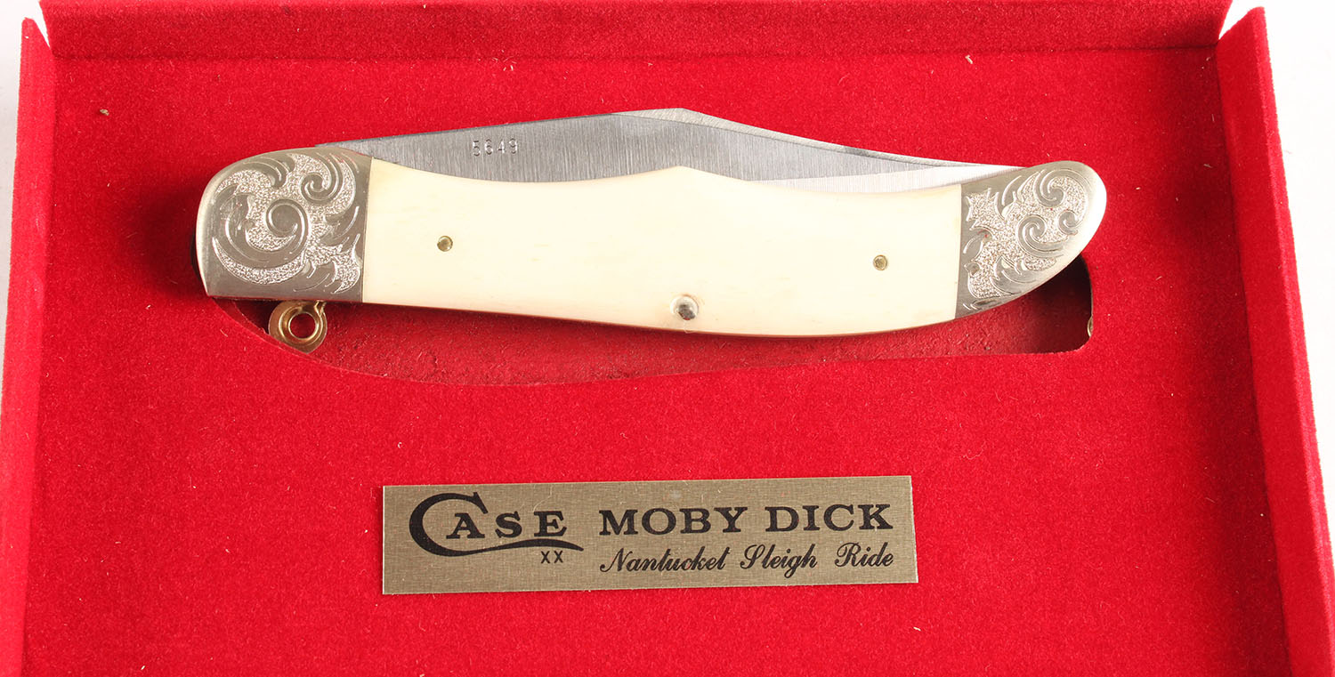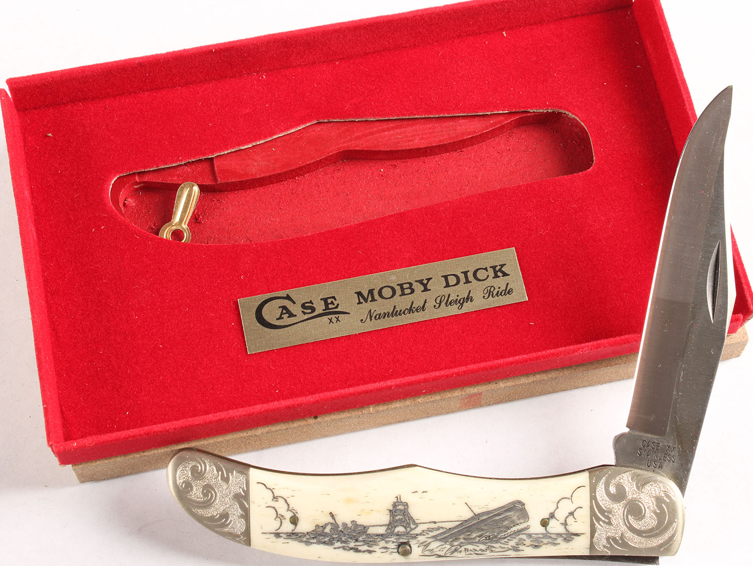 RARE! Case knife, Moby DICK, folding knife, scrimshaw handle 4 1/2'' blade, has wood display box. Grade: Excellent - Value: 100 to 250