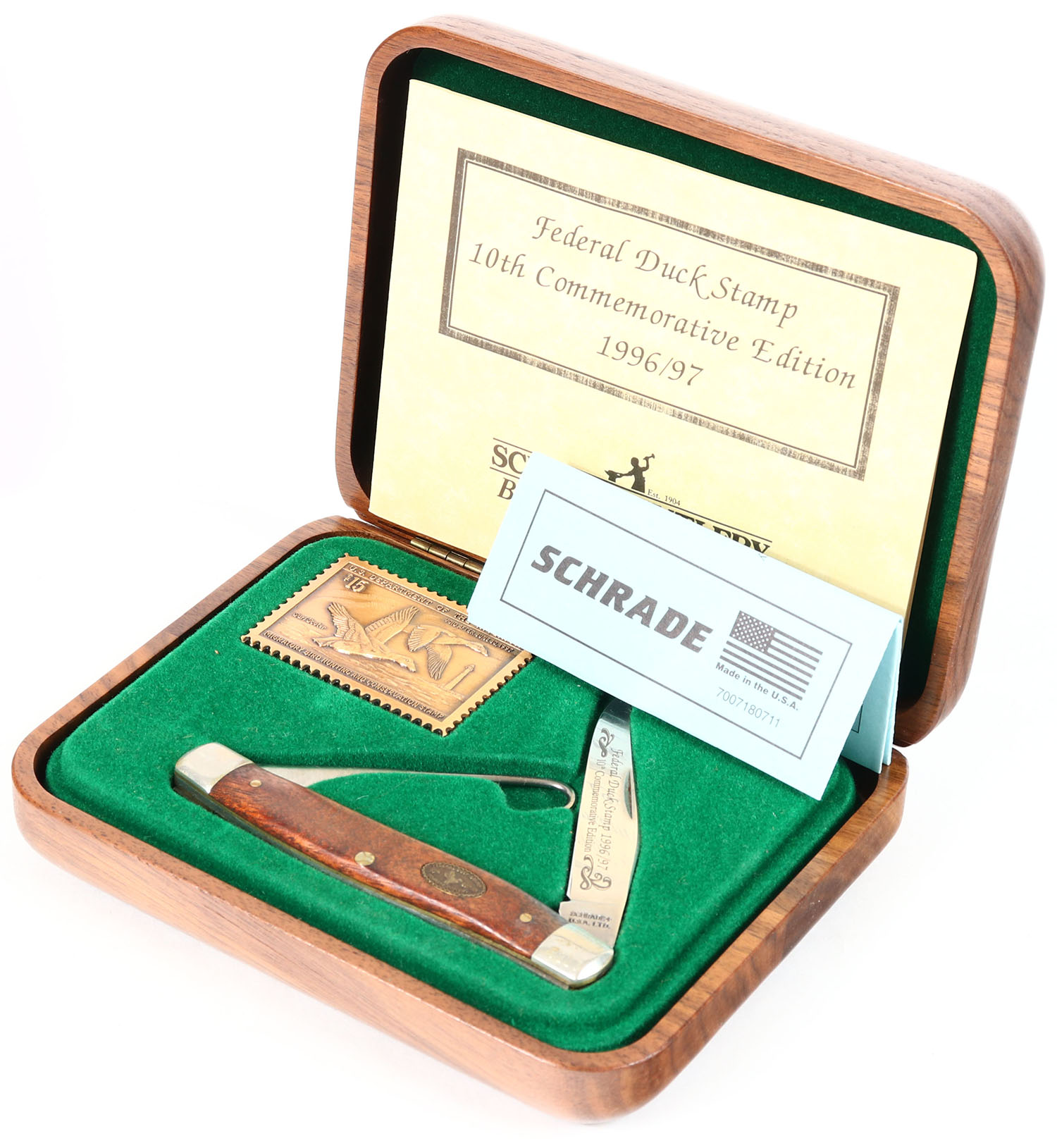 RARE! Schrade Federal; Duck stamp 10th commemorative knife, folding knife, wood handle 3'' blade, has wood display box. Grade: Excellent - Value: 30 to 90