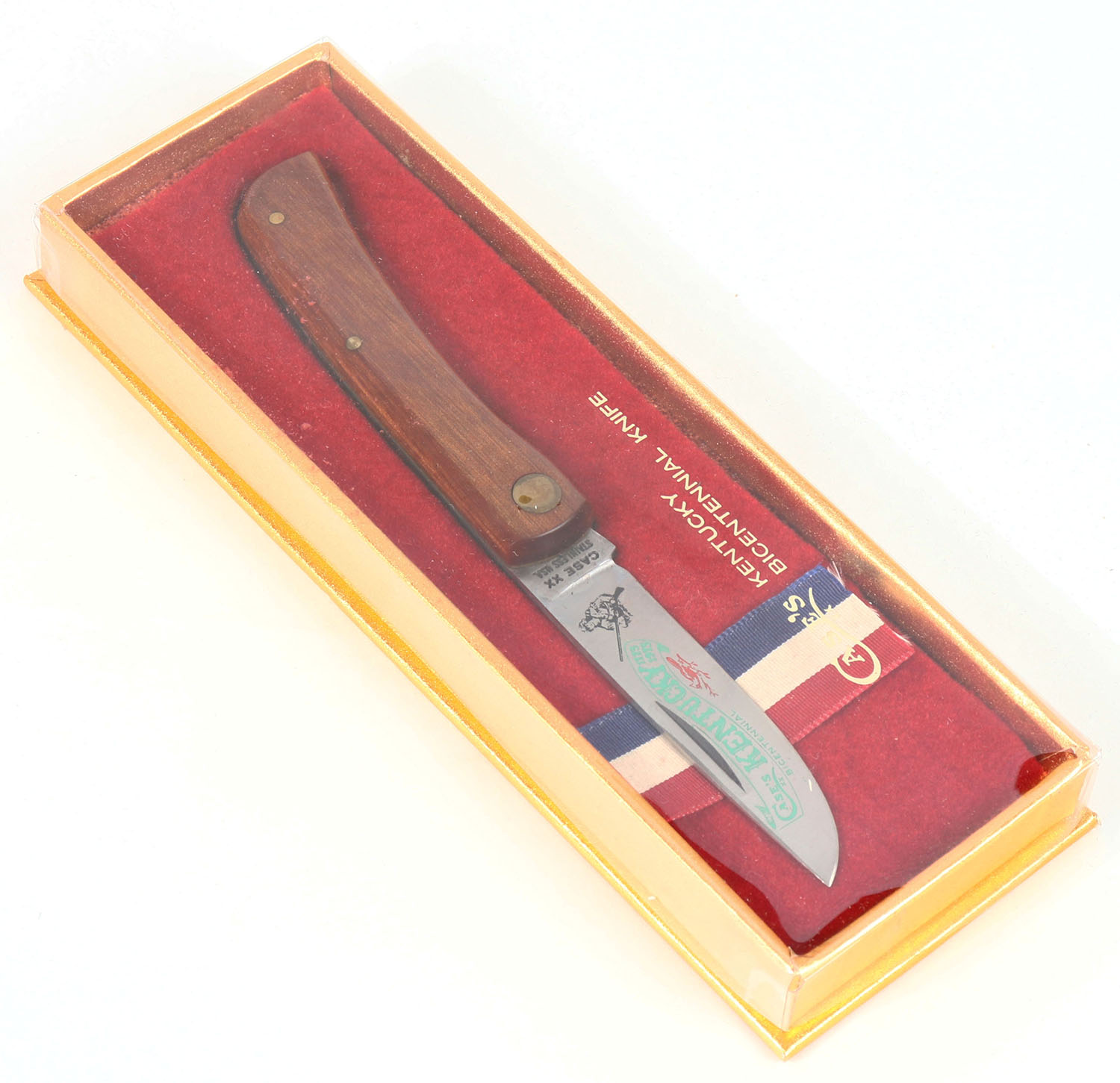 RARE! Case Kentucky Bicentennial knife, wood handle 3'' blade, has display box. Grade: Excellent - Value: 20 to 80