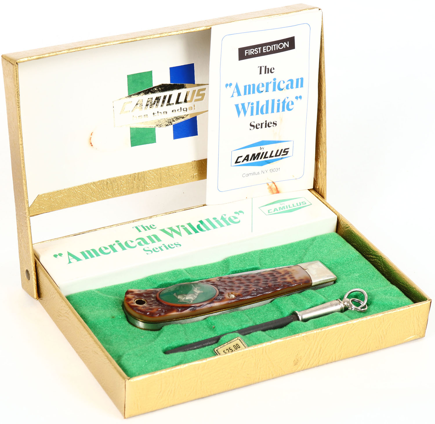 American Wildlife by Camillus, celluloid handle 3 1/2'' blades, has display box. Grade: Excellent - Value: 20 to 60