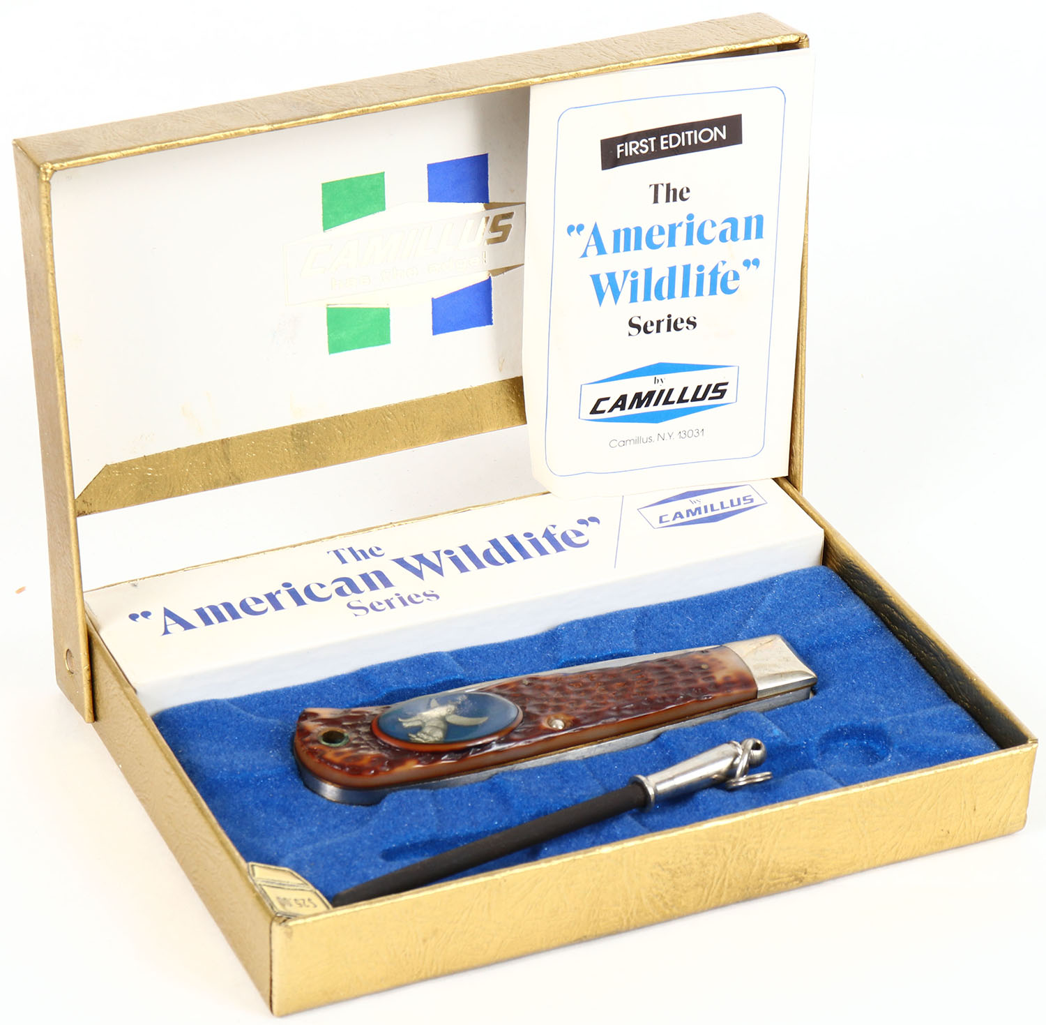 American Wildlife by Camillus, celluloid handle 3 1/2'' blades, has display box. Grade: Excellent - Value: 20 to 60