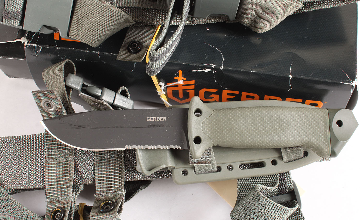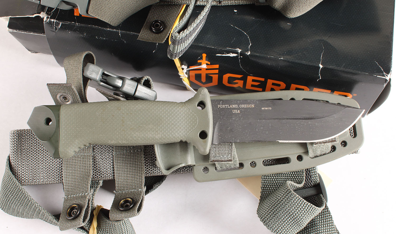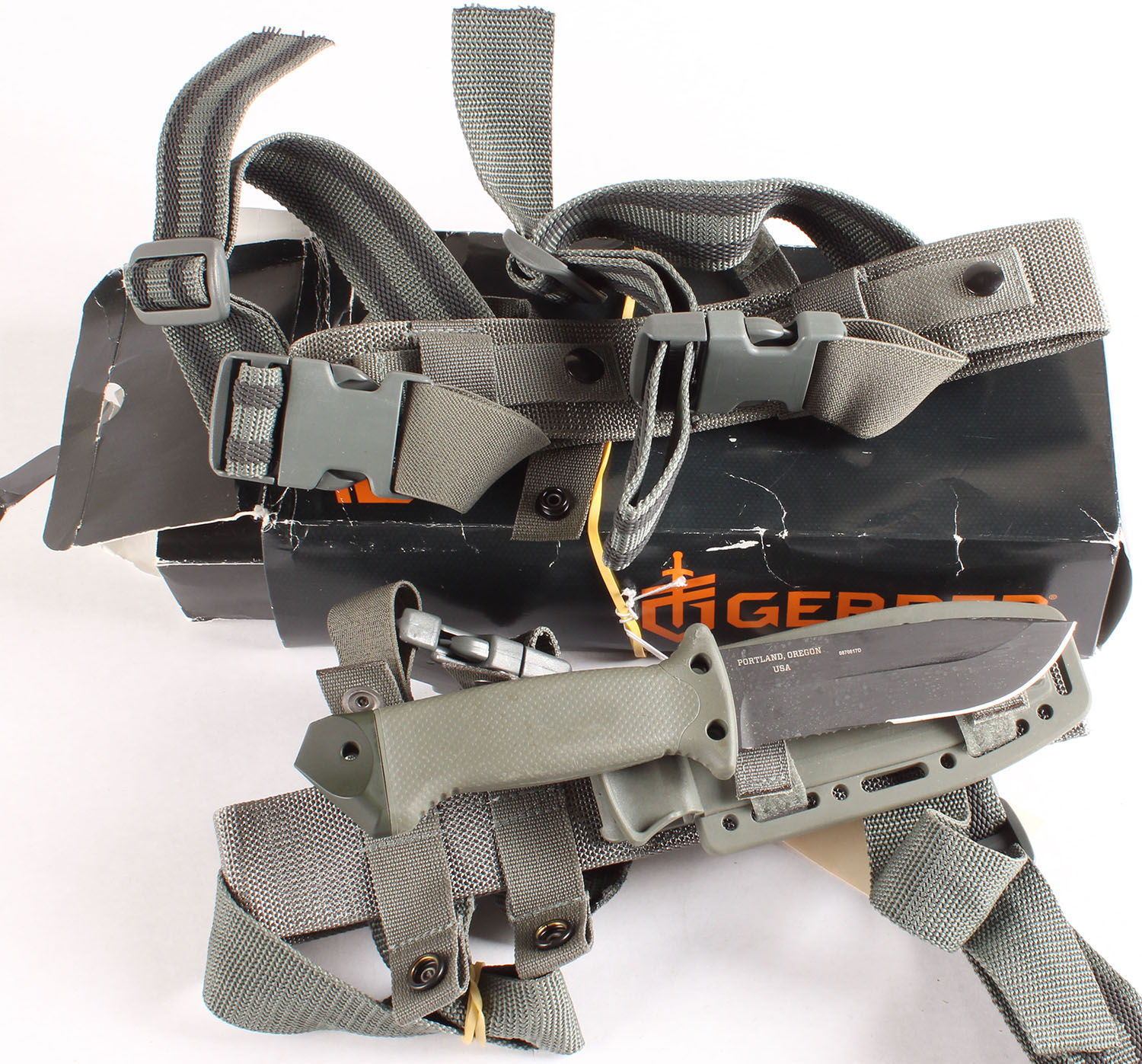 Gerber combat fighter knife, in original box, with sheath and body strap Grade: Excellent ++ - Value: 40 to 100