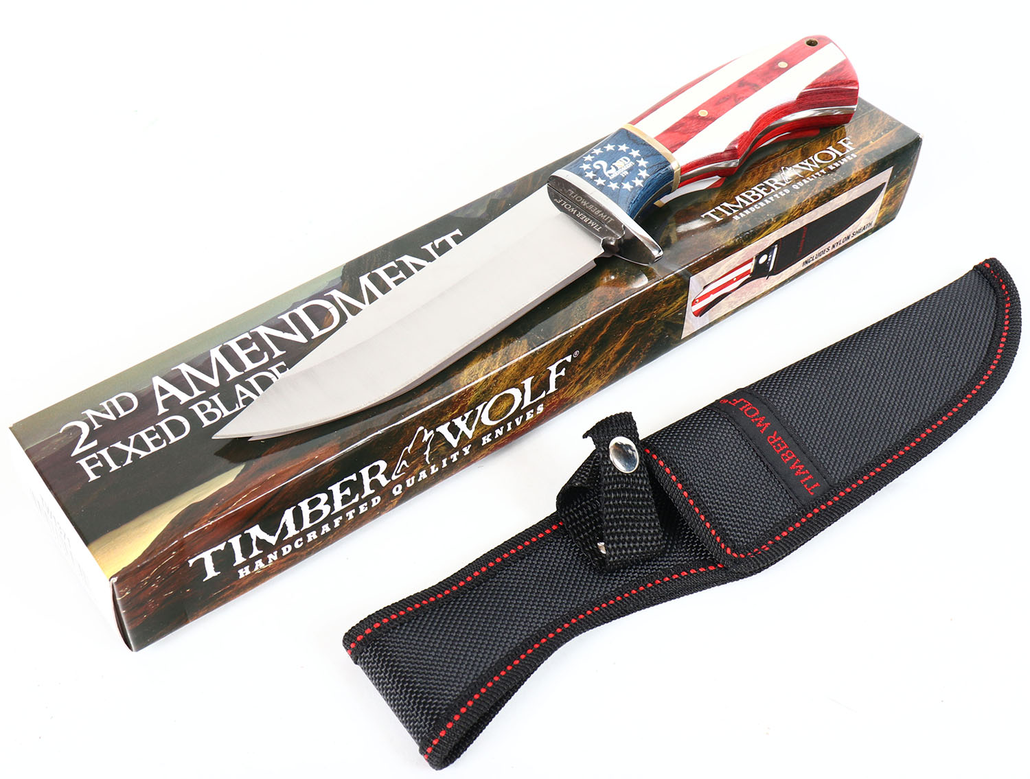 LARGE Timber wolf 2nd amendment knife, has leather sheath, in original box. Grade: Excellent ++ - Value: 6 to 60