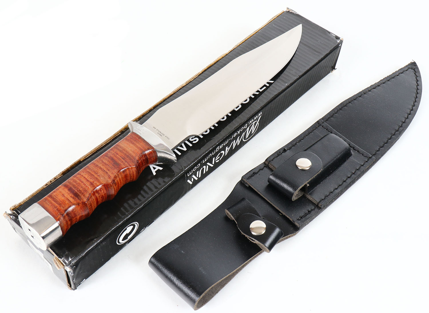 LARGE Boker Magnum knife, has leather sheath, in original box. Grade: Excellent ++ - Value: 16 to 60