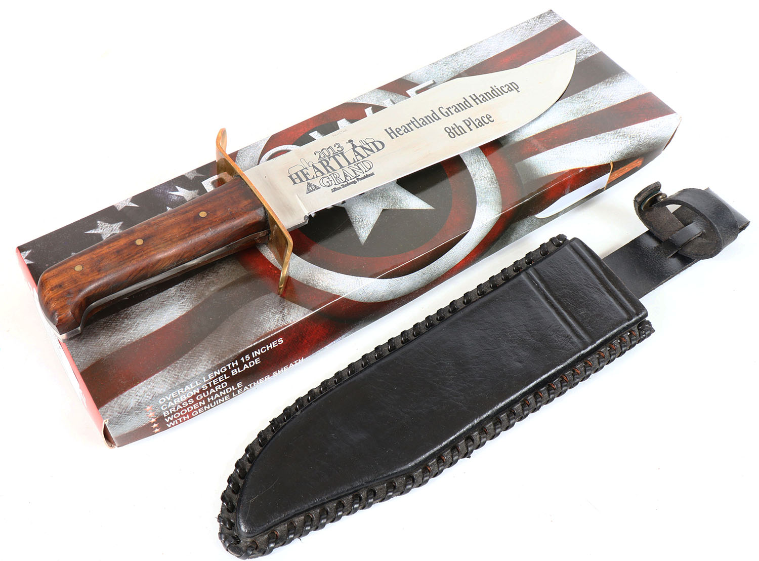 LARGE Bowie knife, has leather sheath, in original box. Grade: Excellent ++ - Value: 40 to 150