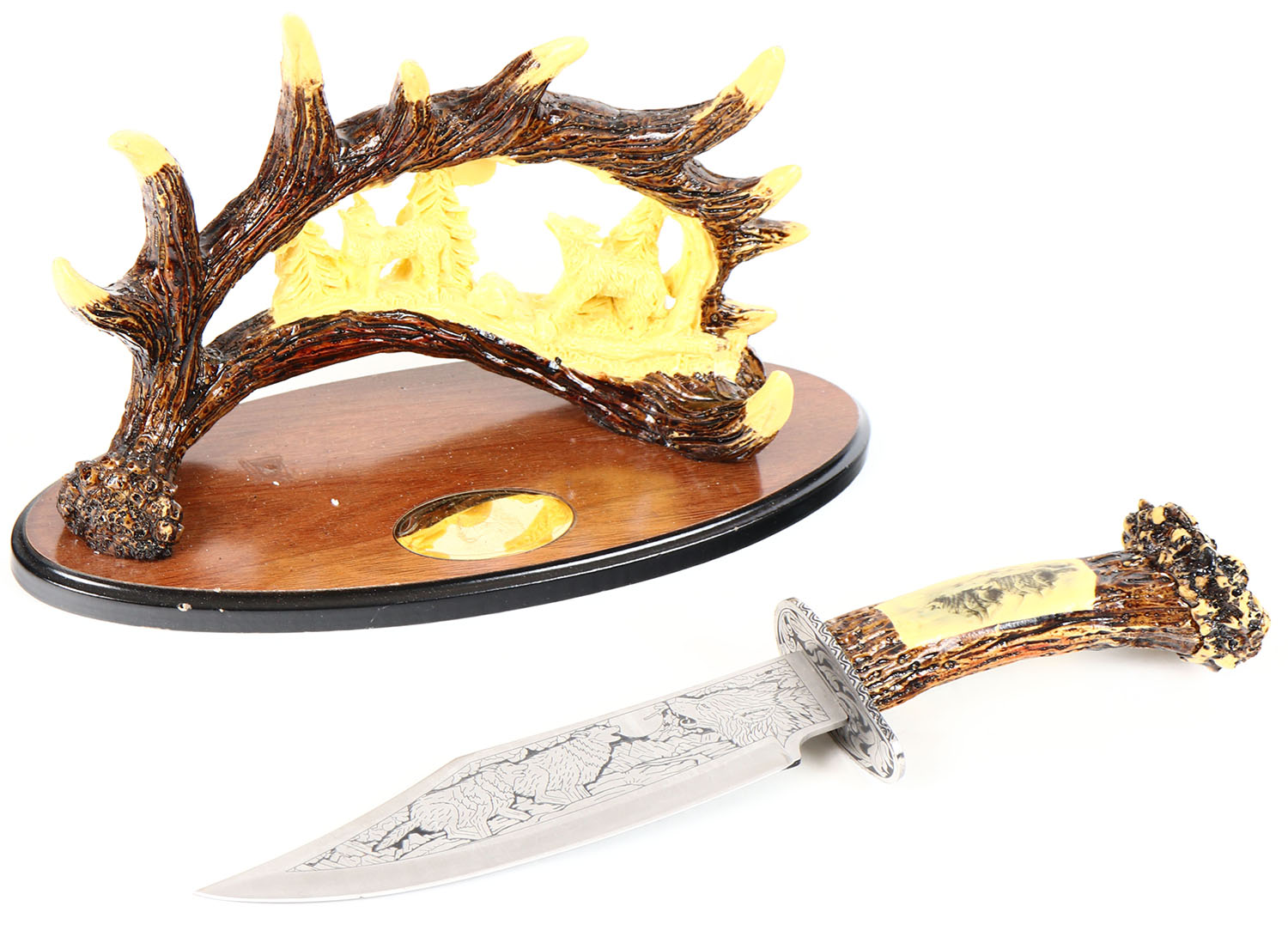 Beautiful knife, no manf markings, has ornate horn knife stand, beautiful handle, wolf scene on blade. Grade: Excellent ++ - Value: 20 to 60