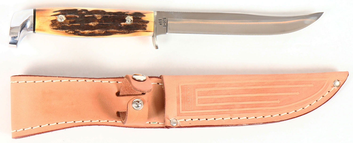 Case knife, leather sheath, half hilt, 5 '' blade, stag handle, leather sheath,. Grade: Excellent ++ - Value: 30 to 90