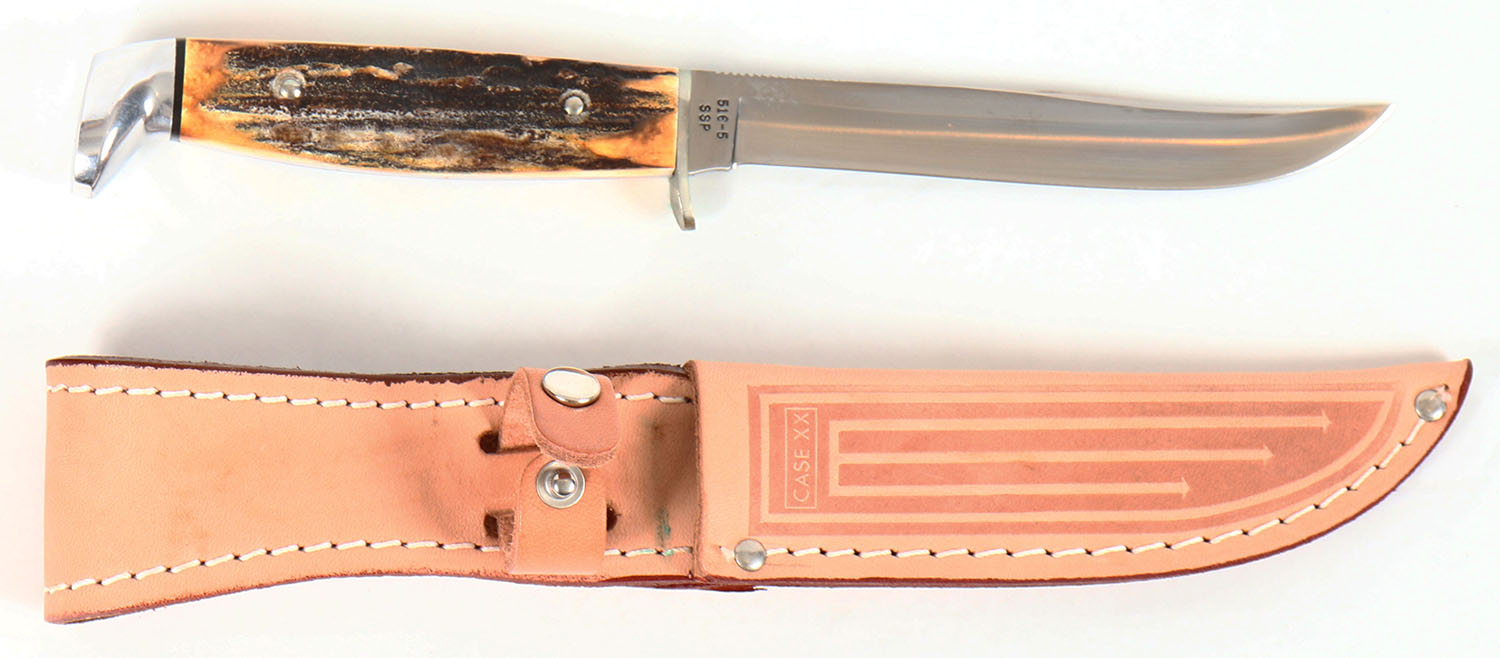 Case knife, leather sheath, half hilt, 5 '' blade, stag handle, leather sheath,. Grade: Excellent ++ - Value: 30 to 90