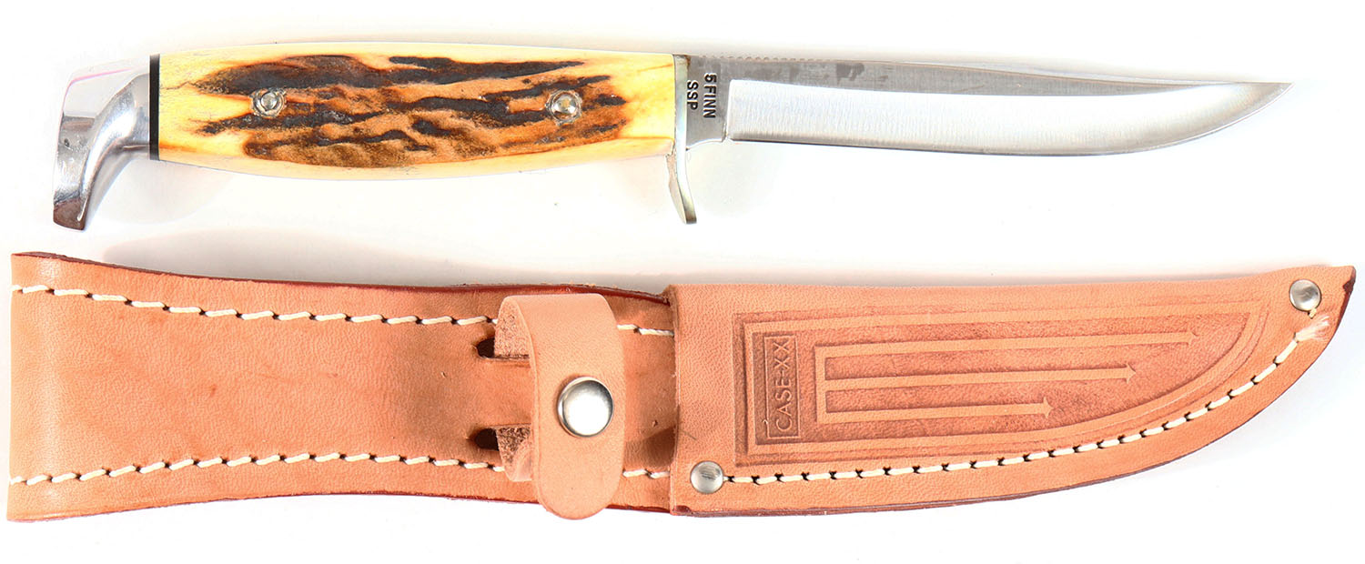 Case knife, leather sheath, half hilt, 5'' blade, stag handle, leather sheath,. Grade: Excellent ++ - Value: 30 to 90