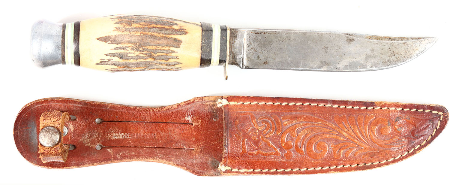 Huberhus? Co. knife, half hilt, stag handle, 4 1/2'' blade, aluminum pommel, blade has been sharpened, has leather sheath. Grade: Very Good + - Value: 20 to 60