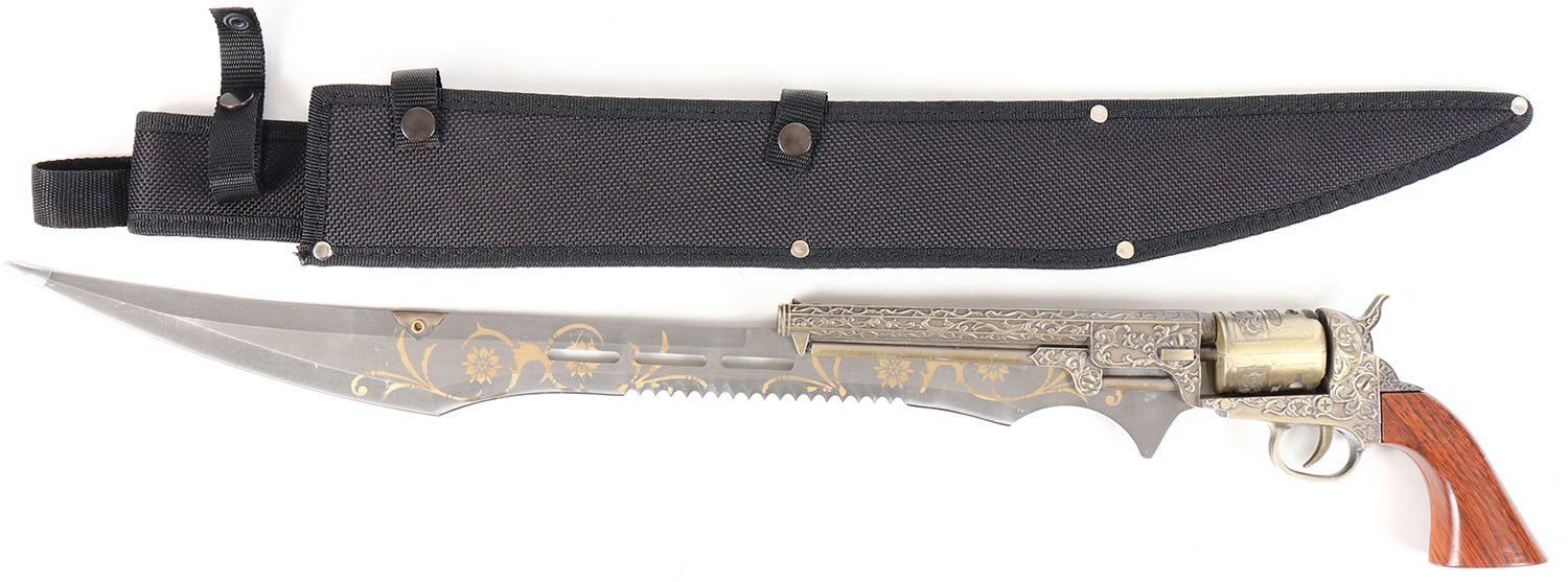 Large modern sword with a handle of a pistol, has a sheath, 18'' blade, bright and clean. Grade: Excellent ++ - Value: 20 to 80